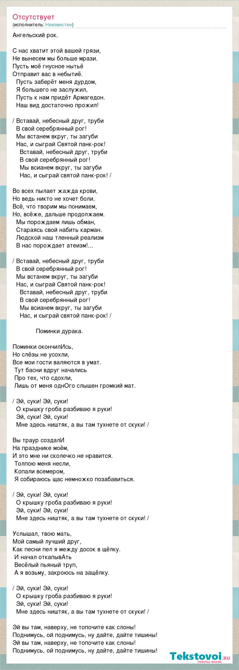 Ангельский рок. С нас хватит этой вашей грязи, Не вынесем мы больше мрази. Пусть моё гнусное нытьё Отправит вас в небытиё. Пусть заберёт меня дурдом, Я большего не заслужил, Пусть к нам придёт Армагедон. Наш вид достаточно прожил! / Вставай, небесный друг, труби В свой серебрянный рог! Мы встанем вкруг, ты загуби Нас, и сыграй Святой панк-рок! Вставай, небесный друг, труби В свой серебрянный рог! Мы всианем вкруг, ты загуби Нас, и сыграй святой панк-рок! / Во всех пылает жажда крови, Но ведь никто не хочет боли. Всё, что творим мы понимаем, Но, всёже, дальше продолжаем. Мы порождаем лишь обман, Стараясь свой набить карман. Людской наш тленный реализм В нас порождает атеизм!... / Вставай, небесный друг, труби В свой серебрянный рог! Мы встанем вкруг, ты загуби Нас, и сыграй Святой панк-рок! Вставай, небесный друг, труби В свой серебрянный рог! Мы всианем вкруг, ты загуби Нас, и сыграй святой панк-рок! / Поминки дурака. Поминки окончилИсь, Но слёзы не усохли, Все мои гости валяются в умат. Тут басни вдруг начались Про тех, что сдохли, Лишь от меня однОго слышен громкий мат. / Эй, суки! Эй, суки! О крышку гроба разбиваю я руки! Эй, суки! Эй, суки! Мне здесь ништяк, а вы там тухнете от скуки! / Вы траур создалИ На празднике моём, И это мне ни сколечко не нравится. Толпою меня несли, Копали всемером, Я собираюсь щас немножко позабавиться. / Эй, суки! Эй, суки! О крышку гроба разбиваю я руки! Эй, суки! Эй, суки! Мне здесь ништяк, а вы там тухнете от скуки! / Услышал, твою мать, Мой самый лучший друг, Как песни пел я между досок в щёлку. И начал откапывАть Весёлый пьяный труп, А я возьму, закроюсь на защёлку. / Эй, суки! Эй, суки! О крышку гроба разбиваю я руки! Эй, суки! Эй, суки! Мне здесь ништяк, а вы там тухнете от скуки! / Эй вы там, наверху, не топочите как слоны! Поднимусь, ой поднимусь, ну дайте, дайте тишины! Эй вы там, наверху, не топочите как слоны! Поднимусь, ой поднимусь, ну дайте, дайте тишины!