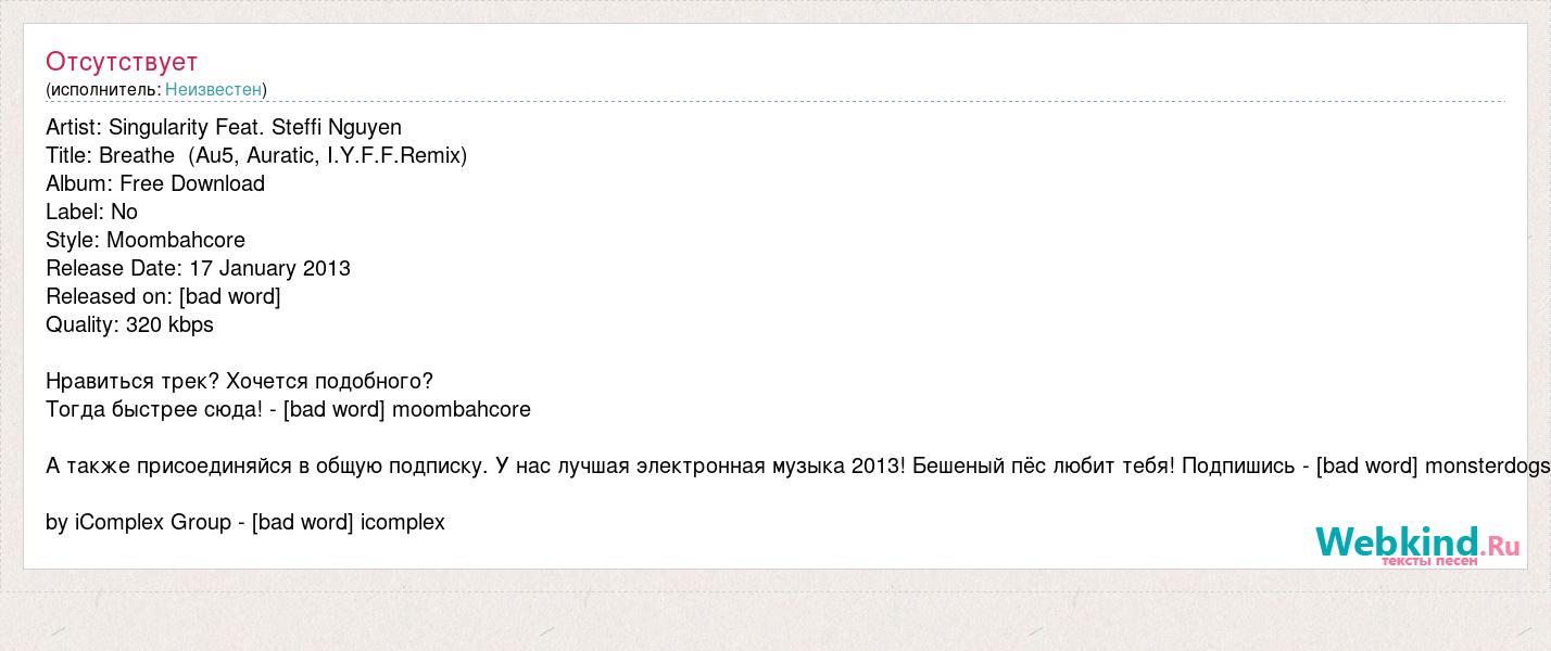 Artist: Singularity Feat. Steffi Nguyen Title: Breathe (Au5, Auratic, I.Y.F.F.Remix) Album: Free Download Label: No Style: Moombahcore Release Date: 17 January 2013 Released on: [bad word] Quality: 320 kbps Нравиться трек? Хочется подобного? Тогда быстрее сюда! - [bad word] moombahcore А также присоединяйся в общую подписку. У нас лучшая электронная музыка 2013! Бешеный пёс любит тебя! Подпишись - [bad word] monsterdogs by [bad word] Group - [bad word] [bad word]