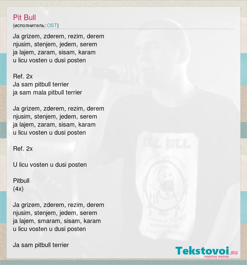 Ja grizem, zderem, rezim, derem njusim, stenjem, jedem, serem ja lajem, zaram, sisam, karam u licu vosten u dusi posten Ref. 2x Ja sam pitbull terrier ja sam mala pitbull terrier Ja grizem, zderem, rezim, derem njusim, stenjem, jedem, serem ja lajem, zaram, sisam, karam u licu vosten u dusi posten Ref. 2x U licu vosten u dusi posten Pitbull (4x) Ja grizem, zderem, rezim, derem njusim, stenjem, jedem, serem ja lajem, smaram, sisam, karam u licu vosten u dusi posten Ja sam pitbull terrier