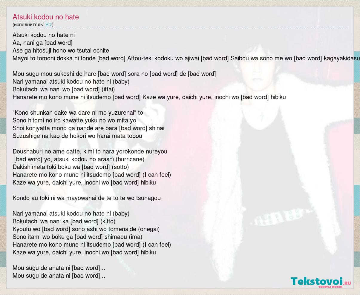 Atsuki kodou no hate ni Aa, nani ga [bad word] Ase ga hitosuji hoho wo tsutai ochite Mayoi to tomoni dokka ni tonde [bad word] Attou-teki kodoku wo ajiwai [bad word] Saibou wa sono me wo [bad word] kagayakidasu Mou sugu mou sukoshi de hare [bad word] sora no [bad word] de [bad word] Nari yamanai atsuki kodou no hate ni (baby) Bokutachi wa nani wo [bad word] (ittai) Hanarete mo kono mune ni itsudemo [bad word] Kaze wa yure, daichi yure, inochi wo [bad word] hibiku "Kono shunkan dake wa dare ni mo yuzurenai" to Sono hitomi no iro kawatte yuku no wo mita yo Shoi konjyatta mono ga nande are bara [bad word] shinai Suzushige na kao de hokori wo harai mata tobou Doushaburi no ame datte, kimi to nara yorokonde nureyou [bad word] yo, atsuki kodou no arashi (hurricane) Dakishimeta toki boku wa [bad word] (sotto) Hanarete mo kono mune ni itsudemo [bad word] (I can feel) Kaze wa yure, daichi yure, inochi wo [bad word] hibiku Kondo au toki ni wa mayowanai de te to te wo tsunagou Nari yamanai atsuki kodou no hate ni (baby) Bokutachi wa nani ka [bad word] (kitto) Kyoufu wo [bad word] sono ashi wo tomenaide (onegai) Sono itami wo boku ga [bad word] shimaou (ima) Hanarete mo kono mune ni itsudemo [bad word] (I can feel) Kaze wa yure, daichi yure, inochi wo [bad word] hibiku Mou sugu de anata ni [bad word] .. Mou sugu de anata ni [bad word] ..