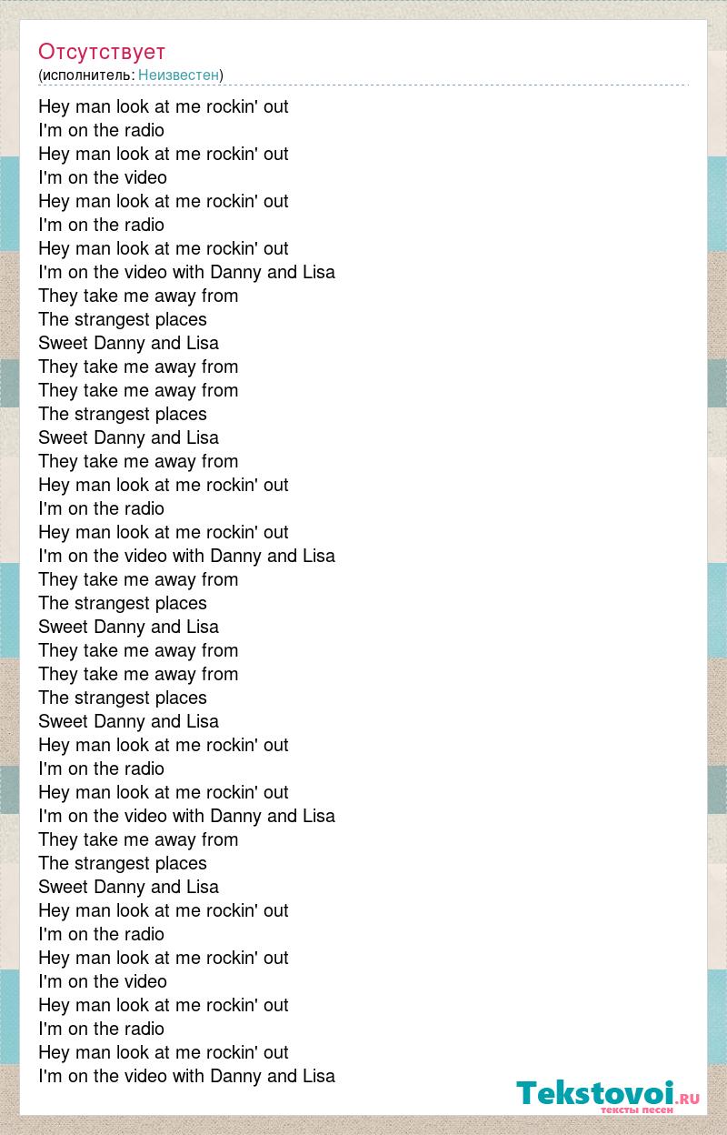Hey man look at me rockin' out I'm on the radio Hey man look at me rockin' out I'm on the video Hey man look at me rockin' out I'm on the radio Hey man look at me rockin' out I'm on the video with Danny and Lisa They take me away from The strangest places Sweet Danny and Lisa They take me away from They take me away from The strangest places Sweet Danny and Lisa They take me away from Hey man look at me rockin' out I'm on the radio Hey man look at me rockin' out I'm on the video with Danny and Lisa They take me away from The strangest places Sweet Danny and Lisa They take me away from They take me away from The strangest places Sweet Danny and Lisa Hey man look at me rockin' out I'm on the radio Hey man look at me rockin' out I'm on the video with Danny and Lisa They take me away from The strangest places Sweet Danny and Lisa Hey man look at me rockin' out I'm on the radio Hey man look at me rockin' out I'm on the video Hey man look at me rockin' out I'm on the radio Hey man look at me rockin' out I'm on the video with Danny and Lisa