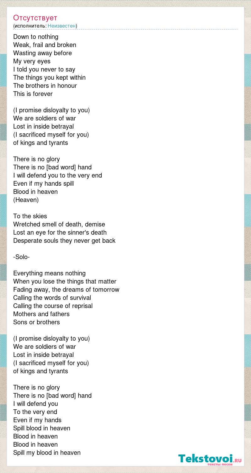 Down to nothing Weak, frail and broken Wasting away before My very eyes I told you never to say The things you kept within The brothers in honour This is forever (I promise disloyalty to you) We are soldiers of war Lost in inside betrayal (I sacrificed myself for you) of kings and tyrants There is no glory There is no [bad word] hand I will defend you to the very end Even if my hands spill Blood in heaven (Heaven) To the skies Wretched smell of death, demise Lost an eye for the sinner's death Desperate souls they never get back -Solo- Everything means nothing When you lose the things that matter Fading away, the dreams of tomorrow Calling the words of survival Calling the course of reprisal Mothers and fathers Sons or brothers (I promise disloyalty to you) We are soldiers of war Lost in inside betrayal (I sacrificed myself for you) of kings and tyrants There is no glory There is no [bad word] hand I will defend you To the very end Even if my hands Spill blood in heaven Blood in heaven Blood in heaven Spill my blood in heaven
