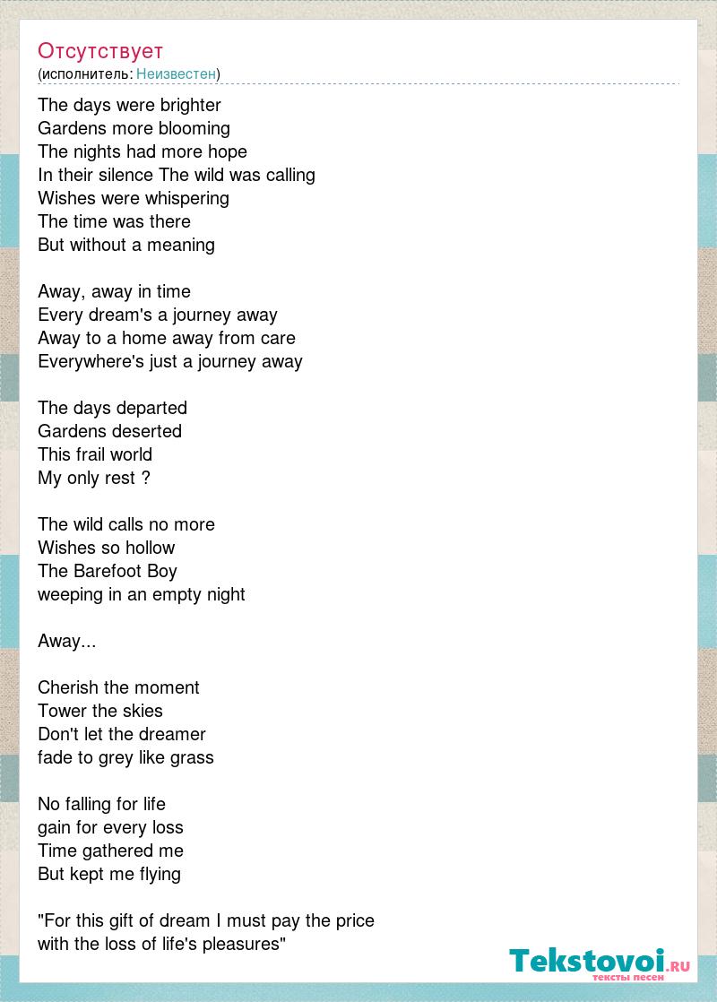 The days were brighter Gardens more blooming The nights had more hope In their silence The wild was calling Wishes were whispering The time was there But without a meaning Away, away in time Every dream's a journey away Away to a home away from care Everywhere's just a journey away The days departed Gardens deserted This frail world My only rest ? The wild calls no more Wishes so hollow The Barefoot Boy weeping in an empty night Away... Cherish the moment Tower the skies Don't let the dreamer fade to grey like grass No falling for life gain for every loss Time gathered me But kept me flying "For this gift of dream I must pay the price with the loss of life's pleasures"