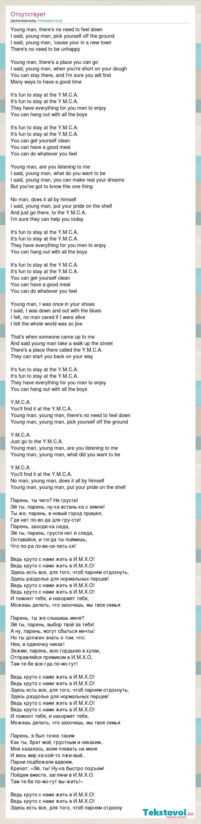 Young man, there's no need to feel down I said, young man, pick yourself off the ground I said, young man, 'cause your in a new town There's no need to be unhappy Young man, there's a place you can go I said, young man, when you're short on your dough You can stay there, and I'm sure you will find Many ways to have a good time It's fun to stay at the Y.M.C.A. It's fun to stay at the Y.M.C.A. They have everything for you men to enjoy You can hang out with all the boys It's fun to stay at the Y.M.C.A. It's fun to stay at the Y.M.C.A. You can get yourself clean You can have a good meal You can do whatever you feel Young man, are you listening to me I said, young man, what do you want to be I said, young man, you can make real your dreams But you've got to know this one thing No man, does it all by himself I said, young man, put your pride on the shelf And just go there, to the Y.M.C.A. I'm sure they can help you today It's fun to stay at the Y.M.C.A. It's fun to stay at the Y.M.C.A. They have everything for you men to enjoy You can hang out with all the boys It's fun to stay at the Y.M.C.A. It's fun to stay at the Y.M.C.A. You can get yourself clean You can have a good meal You can do whatever you feel Young man, I was once in your shoes I said, I was down and out with the blues I felt, no man cared if I were alive I felt the whole world was so jive That's when someone came up to me And said young man take a walk up the street There's a place there called the Y.M.C.A. They can start you back on your way It's fun to stay at the Y.M.C.A. It's fun to stay at the Y.M.C.A. They have everything for you men to enjoy You can hang out with all the boys Y.M.C.A. You'll find it at the Y.M.C.A. Young man, young man, there's no need to feel down Young man, young man, pick yourself off the ground Y.M.C.A. Just go to the Y.M.C.A. Young man, young man, are you listening to me Young man, young man, what did you want to be Y.M.C.A. You'll find it at the Y.M.C.A. No man, young man, does it all by himself Young man, young man, put your pride on the shelf Парень, ты чего? Не грусти! Эй ты, парень, ну-ка встань-ка с земли! Ты же, парень, в новый город пришел, Где нет по-во-да для гру-сти! Парень, заходи-ка сюда, Эй ты, парень, грусти нет и следа, Оставайся, и тогда ты поймешь, Что по-ра по-ве-се-лить-ся! Ведь круто с нами жить в И.М.Х.О! Ведь круто с нами жить в И.М.Х.О! Здесь есть все, для того, чтоб парням отдохнуть, Здесь раздолье для нормальных перцев! Ведь круто с нами жить в И.М.Х.О! Ведь круто с нами жить в И.М.Х.О! И помоют тебя, и накормят тебя, Можешь делать, что захочешь, мы твоя семья Парень, ты же слышишь меня? Эй ты, парень, выбор твой за тебя! А ну, парень, могут сбыться мечты! Но ты должен знать о том, что: Неа, в одиночку никак! Зажми, парень, всю гордыню в кулак, Отправляйся прямиком в И.М.Х.О, Там те-бе все-гда по-мо-гут! Ведь круто с нами жить в И.М.Х.О! Ведь круто с нами жить в И.М.Х.О! Здесь есть все, для того, чтоб парням отдохнуть, Здесь раздолье для нормальных перцев! Ведь круто с нами жить в И.М.Х.О! Ведь круто с нами жить в И.М.Х.О! И помоют тебя, и накормят тебя, Можешь делать, что захочешь, мы твоя семья Парень, я был точно таким Как ты, брат мой, грустным и никаким.. Мне казалось, всем плевать на меня И весь мир ка-кой-то лжи-вый.. Парни подбежали вдвоем, Кричат: «Эй, ты! Ну-ка быстро подъем! Пойдем вместе, загляни в И.М.Х.О. Там те-бе по-мо-гут вы-жить!» Ведь круто с нами жить в И.М.Х.О! Ведь круто с нами жить в И.М.Х.О! Здесь есть все, для того, чтоб парням отдохну