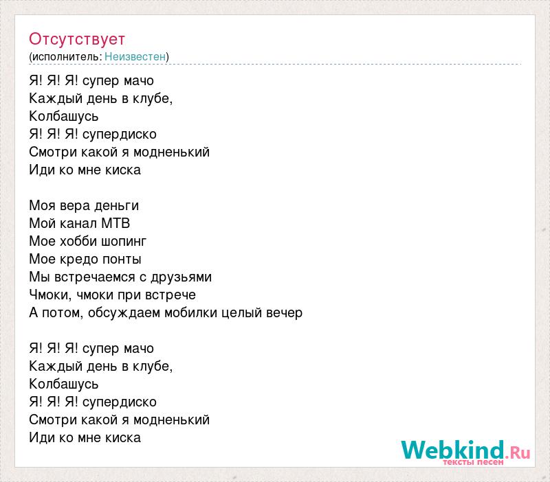 Я! Я! Я! супер мачо Каждый день в клубе, Колбашусь Я! Я! Я! супердиско Смотри какой я модненький Иди ко мне киска Моя вера деньги Мой канал МТВ Мое хобби шопинг Мое кредо понты Мы встречаемся с друзьями Чмоки, чмоки при встрече А потом, обсуждаем мобилки целый вечер Я! Я! Я! супер мачо Каждый день в клубе, Колбашусь Я! Я! Я! супердиско Смотри какой я модненький Иди ко мне киска