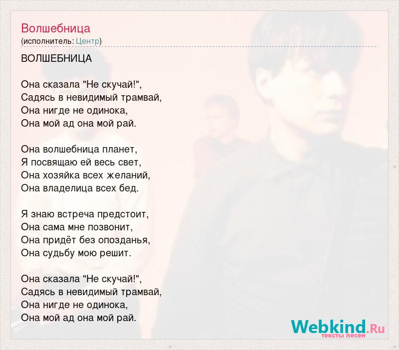 ВОЛШЕБНИЦА Она сказала "Не скучай!", Садясь в невидимый трамвай, Она нигде не одинока, Она мой ад она мой рай. Она волшебница планет, Я посвящаю ей весь свет, Она хозяйка всех желаний, Она владелица всех бед. Я знаю встреча предстоит, Она сама мне позвонит, Она придёт без опозданья, Она судьбу мою решит. Она сказала "Не скучай!", Садясь в невидимый трамвай, Она нигде не одинока, Она мой ад она мой рай.