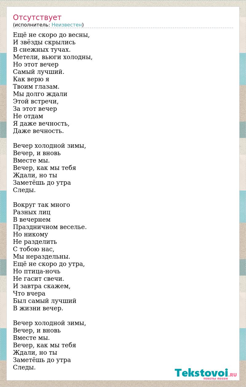 Ещё не скоро до весны, И звёзды скрылись В снежных тучах. Метели, вьюги холодны, Но этот вечер Самый лучший. Как верю я Твоим глазам. Мы долго ждали Этой встречи, За этот вечер Не отдам Я даже вечность, Даже вечность. Вечер холодной зимы, Вечер, и вновь Вместе мы. Вечер, как мы тебя Ждали, но ты Заметёшь до утра Следы. Вокруг так много Разных лиц В вечернем Праздничном веселье. Но никому Не разделить С тобою нас, Мы нераздельны. Ещё не скоро до утра, Но птица-ночь Не гасит свечи. И завтра скажем, Что вчера Был самый лучший В жизни вечер. Вечер холодной зимы, Вечер, и вновь Вместе мы. Вечер, как мы тебя Ждали, но ты Заметёшь до утра Следы.