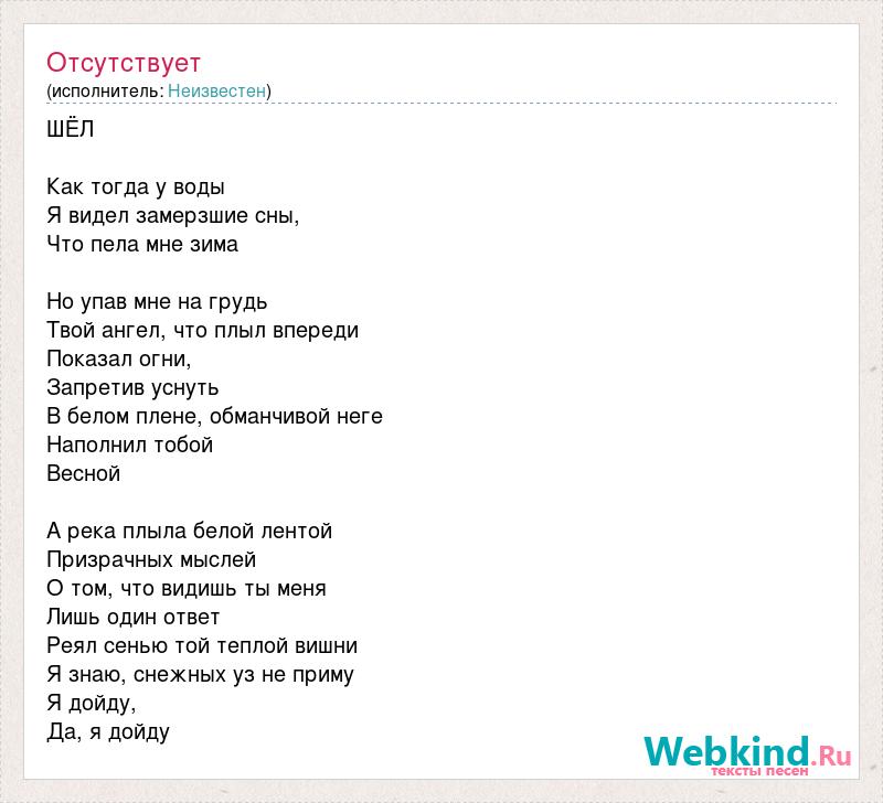ШЁЛ Как тогда у воды Я видел замерзшие сны, Что пела мне зима Но упав мне на грудь Твой ангел, что плыл впереди Показал огни, Запретив уснуть В белом плене, обманчивой неге Наполнил тобой Весной А река плыла белой лентой Призрачных мыслей О том, что видишь ты меня Лишь один ответ Реял cенью той теплой вишни Я знаю, снежных уз не приму Я дойду, Да, я дойду