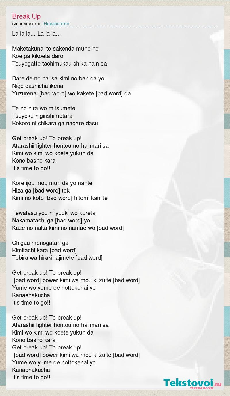 La la la... La la la... Maketakunai to sakenda mune no Koe ga kikoeta daro Tsuyogatte tachimukau shika nain da Dare demo nai sa kimi no ban da yo Nige dashicha ikenai Yuzurenai [bad word] wo kakete [bad word] da Te no hira wo mitsumete Tsuyoku nigirishimetara Kokoro ni chikara ga nagare dasu Get break up! To break up! Atarashii fighter hontou no hajimari sa Kimi wo kimi wo koete yukun da Kono basho kara It's time to go!! Kore ijou mou muri da yo nante Hiza ga [bad word] toki Kimi no koto [bad word] hitomi kanjite Tewatasu you ni yuuki wo kureta Nakamatachi ga [bad word] yo Kaze no naka kimi no namae wo [bad word] Chigau monogatari ga Kimitachi kara [bad word] Tobira wa hirakihajimete [bad word] Get break up! To break up! [bad word] power kimi wa mou ki zuite [bad word] Yume wo yume de hottokenai yo Kanaenakucha It's time to go!! Get break up! To break up! Atarashii fighter hontou no hajimari sa Kimi wo kimi wo koete yukun da Kono basho kara Get break up! To break up! [bad word] power kimi wa mou ki zuite [bad word] Yume wo yume de hottokenai yo Kanaenakucha It's time to go!!