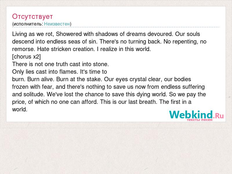 Living as we rot, Showered with shadows of dreams devoured. Our souls descend into endless seas of sin. There's no turning back. No repenting, no remorse. Hate stricken creation. I realize in this world. [bad word] x2] There is not one [bad word] cast into stone. Only lies cast into flames. It's time to burn. Burn alive. Burn at the stake. Our eyes crystal clear, our bodies frozen with fear, and there's nothing to save us now from endless suffering and solitude. We've lost the chance to save this dying world. So we pay the price, of which no one can afford. This is our last breath. The first in a world.