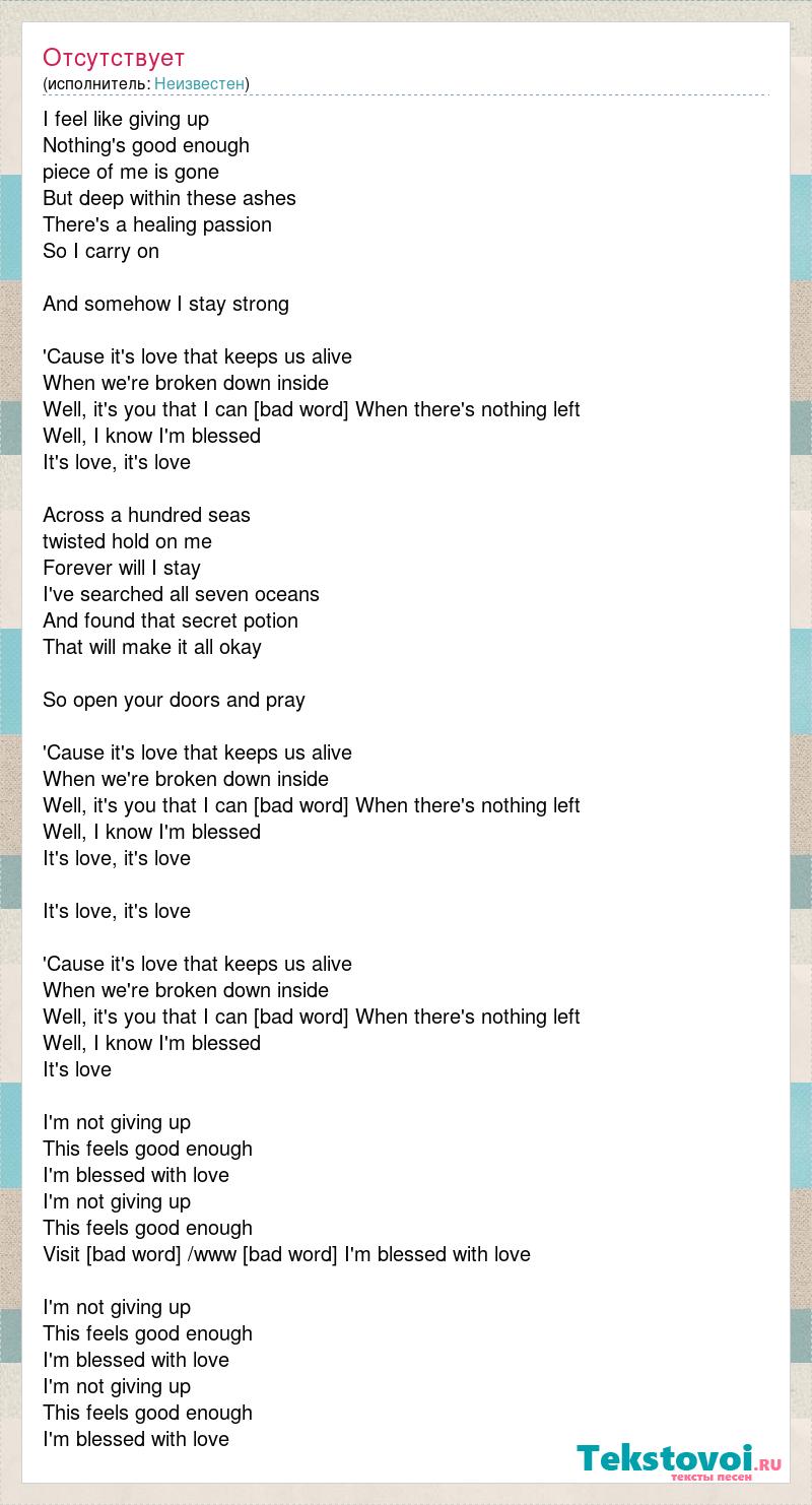 I feel like giving up Nothing's good enough piece of me is gone But deep within these ashes There's a healing passion So I carry on And somehow I stay strong 'Cause it's love that keeps us alive When we're broken down inside Well, it's you that I can [bad word] When there's nothing left Well, I know I'm blessed It's love, it's love Across a hundred seas twisted hold on me Forever will I stay I've searched all seven oceans And found that secret potion That will make it all okay So open your doors and pray 'Cause it's love that keeps us alive When we're broken down inside Well, it's you that I can [bad word] When there's nothing left Well, I know I'm blessed It's love, it's love It's love, it's love 'Cause it's love that keeps us alive When we're broken down inside Well, it's you that I can [bad word] When there's nothing left Well, I know I'm blessed It's love I'm not giving up This feels good enough I'm blessed with love I'm not giving up This feels good enough Visit [bad word] /www [bad word] I'm blessed with love I'm not giving up This feels good enough I'm blessed with love I'm not giving up This feels good enough I'm blessed with love