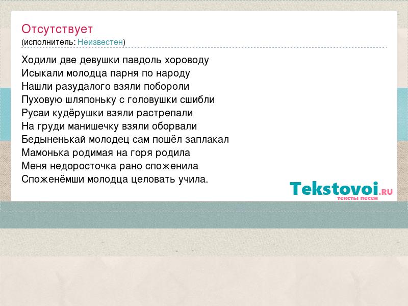 Ходили две девушки павдоль хороводу Исыкали молодца парня по народу Нашли разудалого взяли побороли Пуховую шляпоньку с головушки сшибли Русаи кудёрушки взяли растрепали На груди манишечку взяли оборвали Бедыненькай молодец сам пошёл заплакал Мамонька родимая на горя родила Меня недоросточка рано споженила Споженёмши молодца целовать учила.
