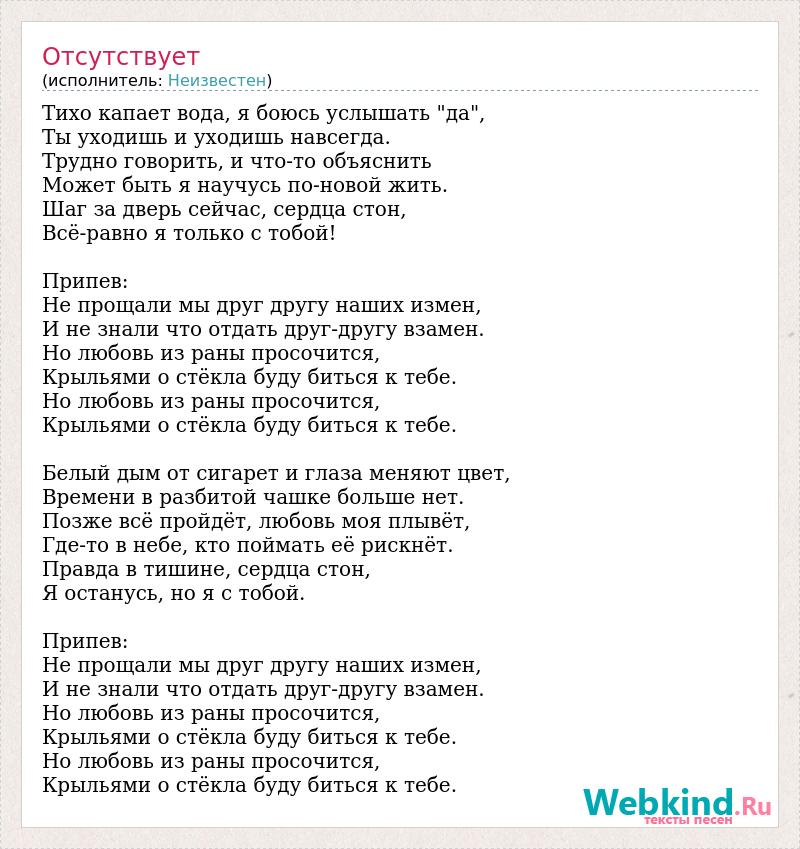Тихо капает вода, я боюсь услышать "да", Ты уходишь и уходишь навсегда. Трудно говорить, и что-то объяснить Может быть я научусь по-новой жить. Шаг за дверь сейчас, сердца стон, Всё-равно я только с тобой! Припев: Не прощали мы друг другу наших измен, И не знали что отдать друг-другу взамен. Но любовь из раны просочится, Крыльями о стёкла буду биться к тебе. Но любовь из раны просочится, Крыльями о стёкла буду биться к тебе. Белый дым от сигарет и глаза меняют цвет, Времени в разбитой чашке больше нет. Позже всё пройдёт, любовь моя плывёт, Где-то в небе, кто поймать её рискнёт. Правда в тишине, сердца стон, Я останусь, но я с тобой. Припев: Не прощали мы друг другу наших измен, И не знали что отдать друг-другу взамен. Но любовь из раны просочится, Крыльями о стёкла буду биться к тебе. Но любовь из раны просочится, Крыльями о стёкла буду биться к тебе.
