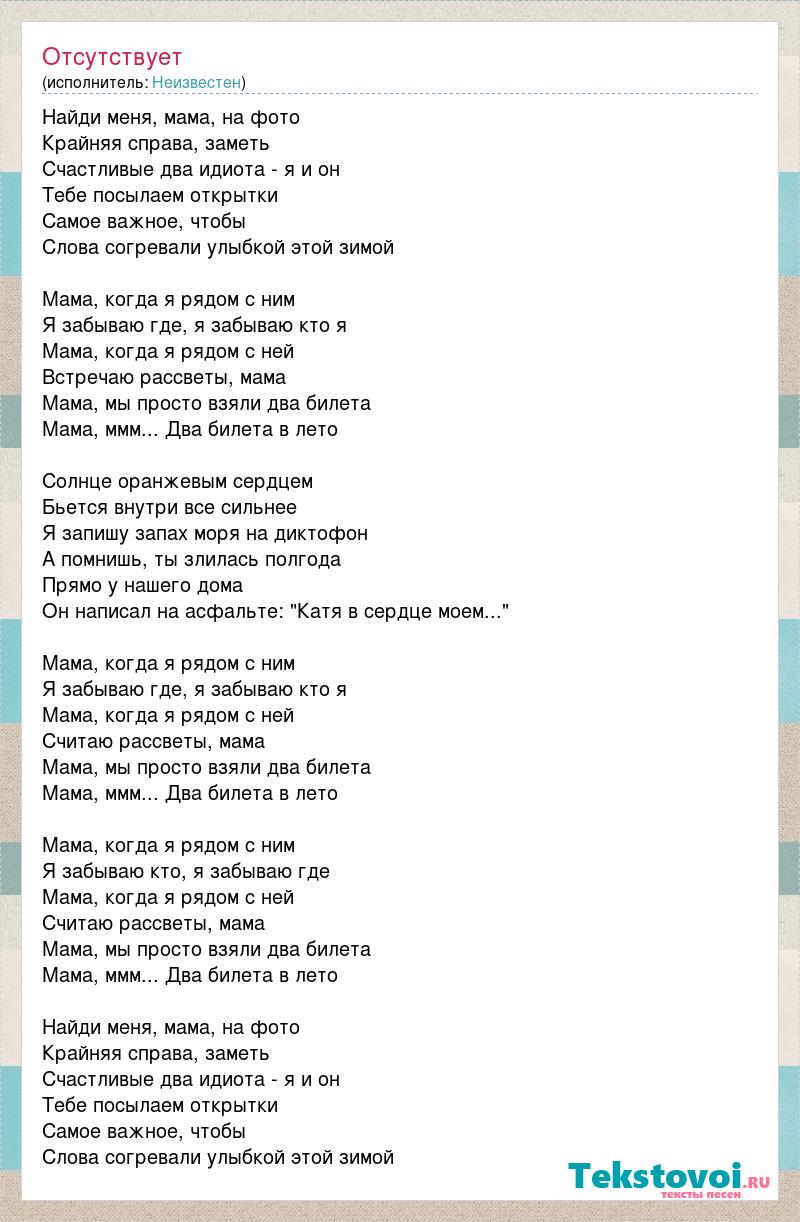 Найди меня, мама, на фото Крайняя справа, заметь Счастливые два идиота - я и он Тебе посылаем открытки Самое важное, чтобы Слова согревали улыбкой этой зимой Мама, когда я рядом с ним Я забываю где, я забываю кто я Мама, когда я рядом с ней Встречаю рассветы, мама Мама, мы просто взяли два билета Мама, ммм... Два билета в лето Солнце оранжевым сердцем Бьется внутри все сильнее Я запишу запах моря на диктофон А помнишь, ты злилась полгода Прямо у нашего дома Он написал на асфальте: "Катя в сердце моем..." Мама, когда я рядом с ним Я забываю где, я забываю кто я Мама, когда я рядом с ней Считаю рассветы, мама Мама, мы просто взяли два билета Мама, ммм... Два билета в лето Мама, когда я рядом с ним Я забываю кто, я забываю где Мама, когда я рядом с ней Считаю рассветы, мама Мама, мы просто взяли два билета Мама, ммм... Два билета в лето Найди меня, мама, на фото Крайняя справа, заметь Счастливые два идиота - я и он Тебе посылаем открытки Самое важное, чтобы Слова согревали улыбкой этой зимой