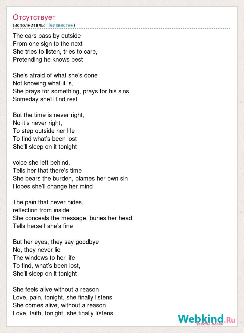The cars pass by outside From one sign to the next She tries to listen, tries to care, Pretending he knows best She’s afraid of what she’s done Not knowing what it is, She prays for something, prays for his sins, Someday she’ll find rest But the time is never right, No it’s never right, To step outside her life To find what’s been lost She’ll sleep on it tonight voice she left behind, Tells her that there’s time She bears the burden, blames her own sin Hopes she’ll change her mind The pain that never hides, reflection from inside She conceals the message, buries her head, Tells herself she’s fine But her eyes, they say goodbye No, they never lie The windows to her life To find, what’s been lost, She’ll sleep on it tonight She feels alive without a reason Love, pain, tonight, she finally listens [bad word] alive, without a reason Love, faith, tonight, she finally lïstens