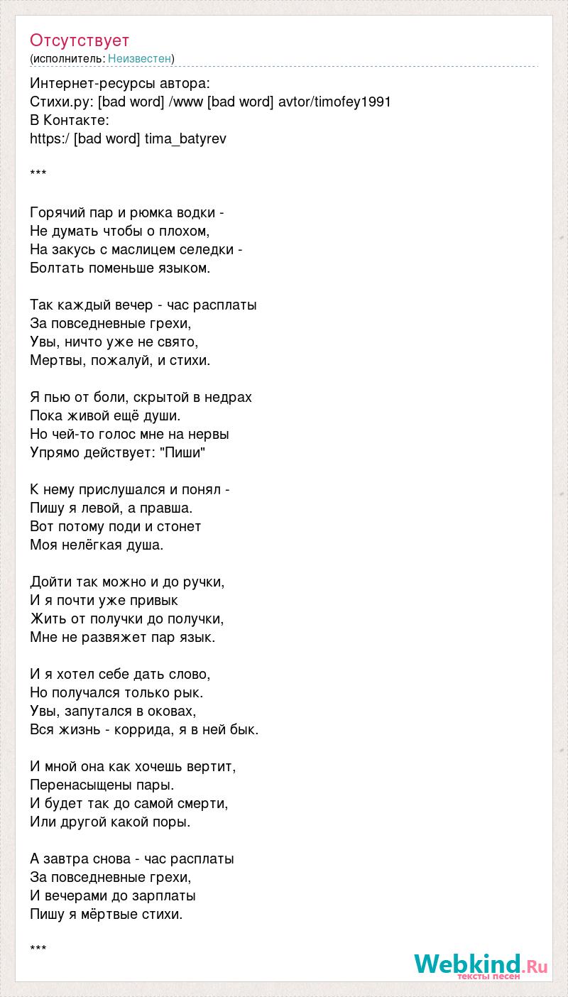 Интернет-ресурсы автора: Стихи.ру: [bad word] /www [bad word] avtor/timofey1991 В Контакте: https:/ [bad word] tima_batyrev *** Горячий пар и рюмка водки - Не думать чтобы о плохом, На закусь с маслицем селедки - Болтать поменьше языком. Так каждый вечер - час расплаты За повседневные грехи, Увы, ничто уже не свято, Мертвы, пожалуй, и стихи. Я пью от боли, скрытой в недрах Пока живой ещё души. Но чей-то голос мне на нервы Упрямо действует: "Пиши" К нему прислушался и понял - Пишу я левой, а правша. Вот потому поди и стонет Моя нелёгкая душа. Дойти так можно и до ручки, И я почти уже привык Жить от получки до получки, Мне не развяжет пар язык. И я хотел себе дать слово, Но получался только рык. Увы, запутался в оковах, Вся жизнь - коррида, я в ней бык. И мной она как хочешь вертит, Перенасыщены пары. И будет так до самой смерти, Или другой какой поры. А завтра снова - час расплаты За повседневные грехи, И вечерами до зарплаты Пишу я мёртвые стихи. ***