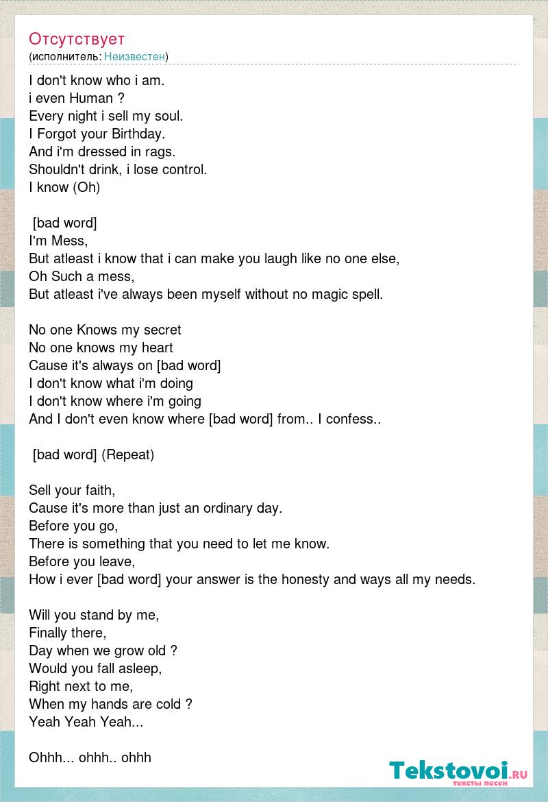 I don't know who i am. i even Human ? Every night i sell my soul. I Forgot your Birthday. And i'm dressed in rags. Shouldn't drink, i lose control. I know (Oh) [bad word] I'm Mess, But atleast i know that i can make you laugh like no one else, Oh Such a mess, But atleast i've always been myself without no magic spell. No one Knows my secret No one knows my heart Cause it's always on [bad word] I don't know what i'm doing I don't know where i'm going And I don't even know where [bad word] from.. I confess.. [bad word] (Repeat) Sell your faith, Cause it's more than just an ordinary day. Before you go, There is something that you need to let me know. Before you leave, How i ever [bad word] your answer is the honesty and ways all my needs. Will you stand by me, Finally there, Day when we grow old ? Would you fall asleep, Right next to me, When my hands are cold ? Yeah Yeah Yeah... Ohhh... ohhh.. ohhh