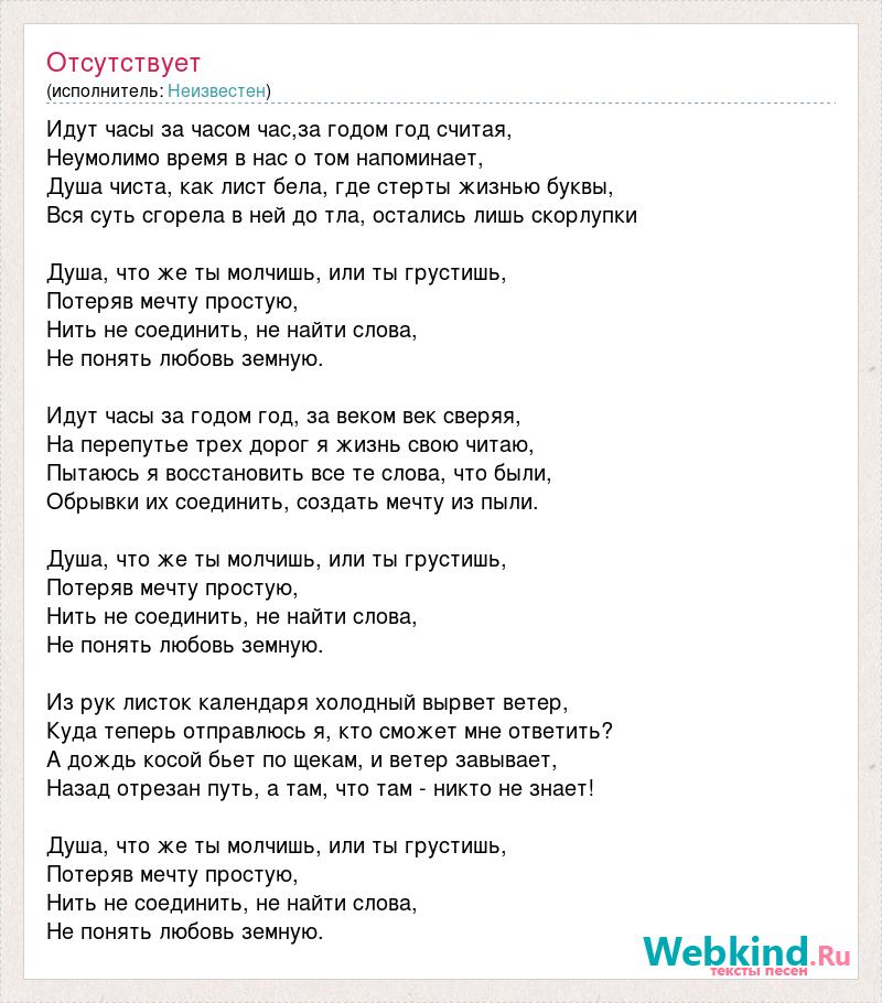 Идут часы за часом час,за годом год считая, Неумолимо время в нас о том напоминает, Душа чиста, как лист бела, где стерты жизнью буквы, Вся суть сгорела в ней до тла, остались лишь скорлупки Душа, что же ты молчишь, или ты грустишь, Потеряв мечту простую, Нить не соединить, не найти слова, Не понять любовь земную. Идут часы за годом год, за веком век сверяя, На перепутье трех дорог я жизнь свою читаю, Пытаюсь я восстановить все те слова, что были, Обрывки их соединить, создать мечту из пыли. Душа, что же ты молчишь, или ты грустишь, Потеряв мечту простую, Нить не соединить, не найти слова, Не понять любовь земную. Из рук листок календаря холодный вырвет ветер, Куда теперь отправлюсь я, кто сможет мне ответить? А дождь косой бьет по щекам, и ветер завывает, Назад отрезан путь, а там, что там - никто не знает! Душа, что же ты молчишь, или ты грустишь, Потеряв мечту простую, Нить не соединить, не найти слова, Не понять любовь земную.