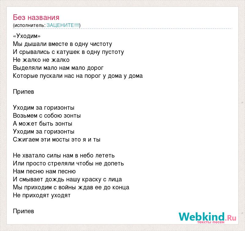«Уходим» Мы дышали вместе в одну чистоту И срывались с катушек в одну пустоту Не жалко не жалко Выделяли мало нам мало дорог Которые пускали нас на порог у дома у дома Припев Уходим за горизонты Возьмем с собою зонты А может быть зонты Уходим за горизонты Сжигаем эти мосты это я и ты Не хватало силы нам в небо лететь Или просто стреляли чтобы не допеть Нам песню нам песню И смывает дождь нашу краску с лица Мы приходим с войны ждав ее до конца Не приходят уходят Припев
