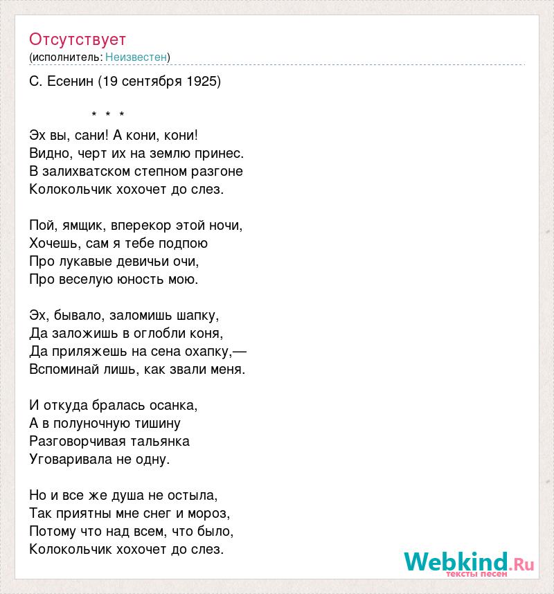 С. Есенин (19 сентября 1925) * * * Эх вы, сани! А кони, кони! Видно, черт их на землю принес. В залихватском степном разгоне Колокольчик хохочет до слез. Пой, ямщик, вперекор этой ночи, Хочешь, сам я тебе подпою Про лукавые девичьи очи, Про веселую юность мою. Эх, бывало, заломишь шапку, Да заложишь в оглобли коня, Да приляжешь на сена охапку,— Вспоминай лишь, как звали меня. И откуда бралась осанка, А в полуночную тишину Разговорчивая тальянка Уговаривала не одну. Но и все же душа не остыла, Так приятны мне снег и мороз, Потому что над всем, что было, Колокольчик хохочет до слез.