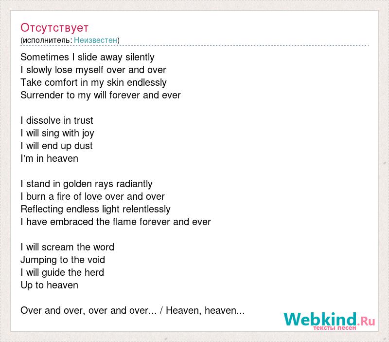 Sometimes I slide away silently I slowly lose myself over and over [bad word] in my skin endlessly Surrender to my will forever and ever I dissolve in [bad word] I will sing with joy I will end up dust I'm in heaven I stand in golden rays radiantly I burn a fire of love over and over Reflecting endless light relentlessly I have embraced the flame forever and ever I will scream the word Jumping to the void I will guide the herd Up to heaven Over and over, over and over... / Heaven, heaven...