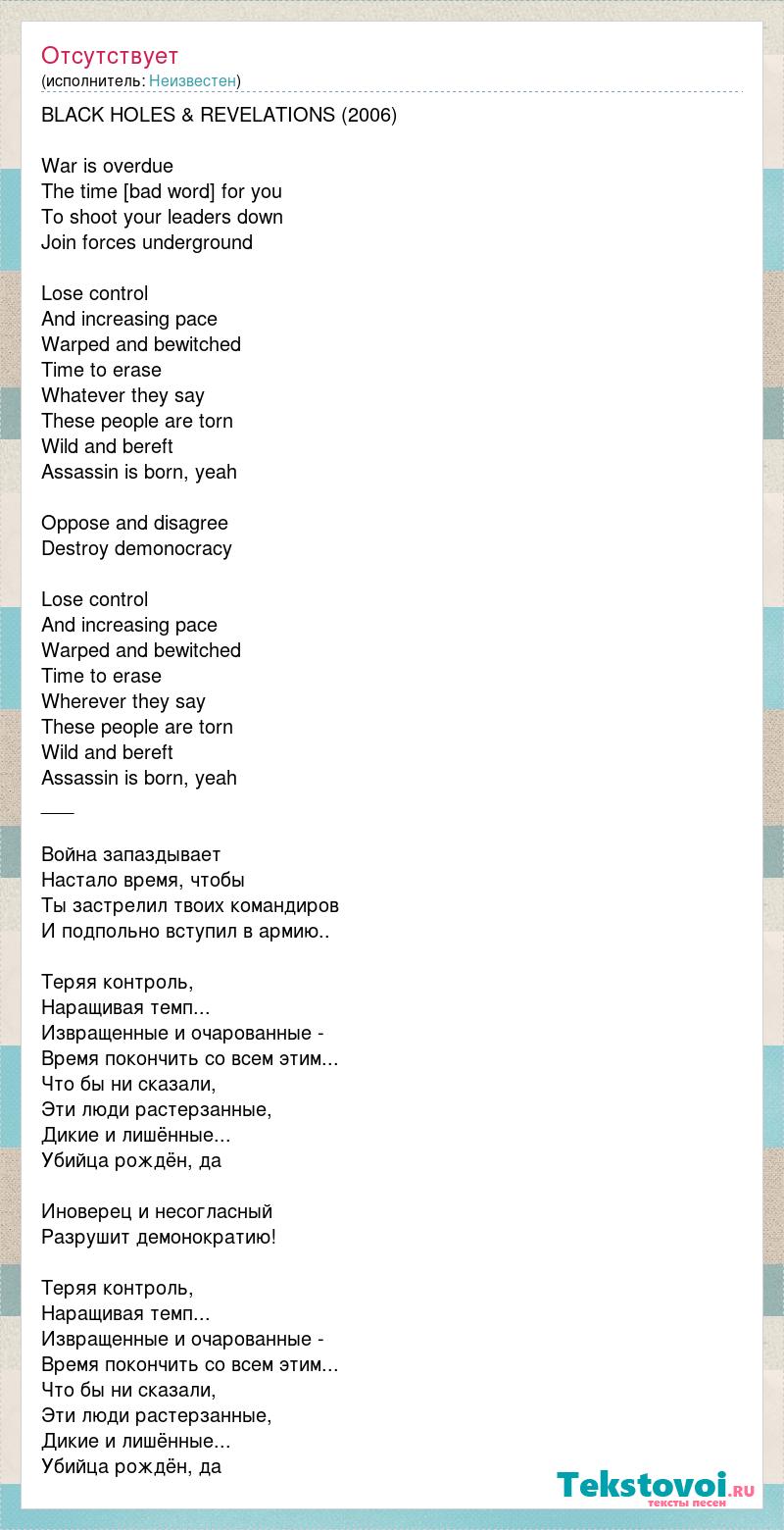 BLACK HOLES & REVELATIONS (2006) War is overdue The time [bad word] for you To shoot your leaders down Join forces underground Lose control And increasing pace Warped and bewitched Time to erase Whatever they say These people are torn Wild and bereft Assassin is born, yeah Oppose and disagree Destroy demonocracy Lose control And increasing pace Warped and bewitched Time to erase Wherever they say These people are torn Wild and bereft Assassin is born, yeah ___ Война запаздывает Настало время, чтобы Ты застрелил твоих командиров И подпольно вступил в армию.. Теряя контроль, Наращивая темп... Извращенные и очарованные - Время покончить со всем этим... Что бы ни сказали, Эти люди растерзанные, Дикие и лишённые... Убийца рождён, да Иноверец и несогласный Разрушит демонократию! Теряя контроль, Наращивая темп... Извращенные и очарованные - Время покончить со всем этим... Что бы ни сказали, Эти люди растерзанные, Дикие и лишённые... Убийца рождён, да