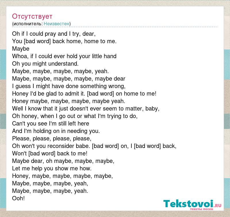 Oh if I could pray and I try, dear, You [bad word] back home, home to me. Maybe Whoa, if I could ever hold your little hand Oh you might understand. Maybe, maybe, maybe, maybe, yeah. Maybe, maybe, maybe, maybe, maybe dear I guess I might have done something wrong, Honey I'd be glad to admit it. [bad word] on home to me! Honey maybe, maybe, maybe, maybe yeah. Well I know that it just doesn't ever seem to matter, baby, Oh honey, when I go out or what I'm trying to do, Can't you see I'm still left here And I'm holding on in needing you. Please, please, please, please, Oh won't you reconsider babe. [bad word] on, I [bad word] back, Won't [bad word] back to me! Maybe dear, oh maybe, maybe, maybe, Let me help you show me how. Honey, maybe, maybe, maybe, maybe, Maybe, maybe, maybe, yeah, Maybe, maybe, maybe, yeah. Ooh!
