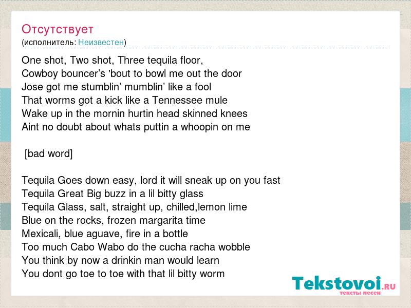 One shot, Two shot, Three tequila floor, Cowboy bouncer’s 'bout to bowl me out the door Jose got me stumblin’ mumblin’ like a fool That worms got a kick like a Tennessee mule Wake up in the mornin hurtin head skinned knees Aint no doubt about whats puttin a whoopin on me [bad word] Tequila Goes down easy, lord it will sneak up on you fast Tequila Great Big buzz in a lil bitty glass Tequila Glass, salt, straight up, chilled,lemon lime Blue on the rocks, frozen margarita time Mexicali, blue aguave, fire in a bottle Too much Cabo Wabo do the cucha racha wobble You think by now a drinkin man would learn You dont go toe to toe with that lil bitty worm