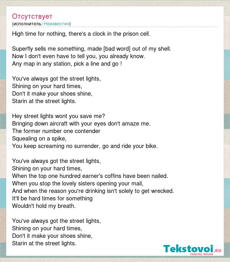 High time for nothing, there's a clock in the prison cell. Superfly sells me something, made [bad word] out of my shell. Now I don't even have to tell you, you already know. Any map in any station, pick a line and go ! You've always got the street lights, Shining on your hard times, Don't it make your shoes shine, Starin at the street lights. Hey street lights wont you save me? Bringing down aircraft with your eyes don't amaze me. The former number one contender Squealing on a spike, You keep screaming no surrender, go and ride your bike. You've always got the street lights, Shining on your hard times, When the top one hundred earner's coffins have been nailed. When you stop the lovely sisters opening your mail, And when the reason you're drinking isn't solely to get wrecked. It'll be hard times for something Wouldn't hold my breath. You've always got the street lights, Shining on your hard times, Don't it make your shoes shine, Starin at the street lights.