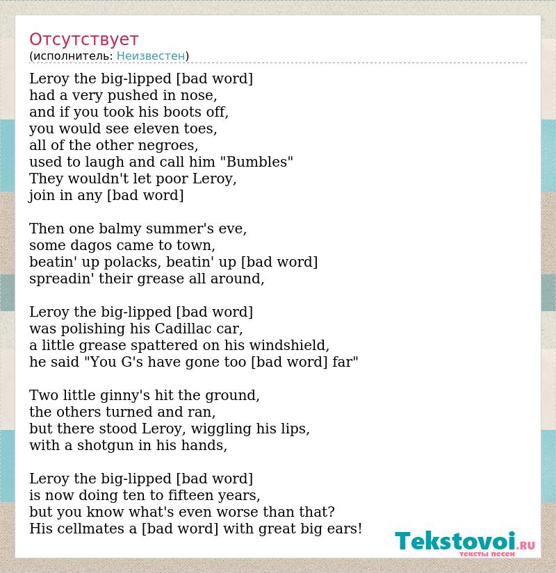 Leroy the big-lipped [bad word] had a very pushed in nose, and if you took his boots off, you would see eleven toes, all of the other negroes, used to laugh and call him "Bumbles" They wouldn't let poor Leroy, join in any [bad word] Then one balmy summer's eve, some dagos came to town, beatin' up polacks, beatin' up [bad word] spreadin' their grease all around, Leroy the big-lipped [bad word] was polishing his Cadillac car, a little grease spattered on his windshield, he said "You G's have gone too [bad word] far" Two little ginny's hit the ground, the others turned and ran, but there stood Leroy, wiggling his lips, with a shotgun in his hands, Leroy the big-lipped [bad word] is now doing ten to fifteen years, but you know what's even worse than that? His cellmates a [bad word] with great big ears!