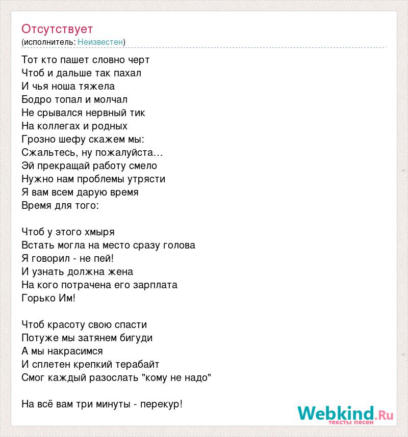 Тот кто пашет словно черт Чтоб и дальше так пахал И чья ноша тяжела Бодро топал и молчал Не срывался нервный тик На коллегах и родных Грозно шефу скажем мы: Сжальтесь, ну пожалуйста… Эй прекращай работу смело Нужно нам проблемы утрясти Я вам всем дарую время Время для того: Чтоб у этого хмыря Встать могла на место сразу голова Я говорил - не пей! И узнать должна жена На кого потрачена его зарплата Горько Им! Чтоб красоту свою спасти Потуже мы затянем бигуди А мы накрасимся И сплетен крепкий терабайт Смог каждый разослать "кому не надо" На всё вам три минуты - перекур!