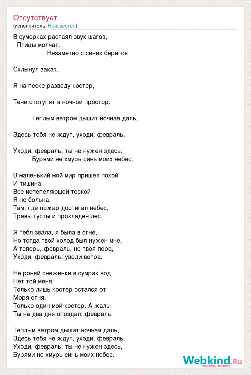 В сумерках растаял звук шагов, Птицы молчат. Незаметно с синих берегов Схлынул закат. Я на песке разведу костер, Тени отступят в ночной простор. Теплым ветром дышит ночная даль, Здесь тебя не ждут, уходи, февраль. Уходи, февраль, ты не нужен здесь, Бурями не хмурь синь моих небес. В маленький мой мир пришел покой И тишина. Все испепеляющей тоской Я не больна. Там, где пожар достигал небес, Травы густы и прохладен лес. Я тебя звала, я была в огне, Но тогда твой холод был нужен мне, А теперь, февраль, не твоя пора, Уходи, февраль, уводи ветра. Не роняй снежинки в сумрак вод, Нет той меня. Только лишь костер остался от Моря огня. Только один мой костер. А жаль - Ты на два дня опоздал, февраль. Теплым ветром дышит ночная даль, Здесь тебя не ждут, уходи, февраль. Уходи, февраль, ты не нужен здесь, Бурями не хмурь синь моих небес.