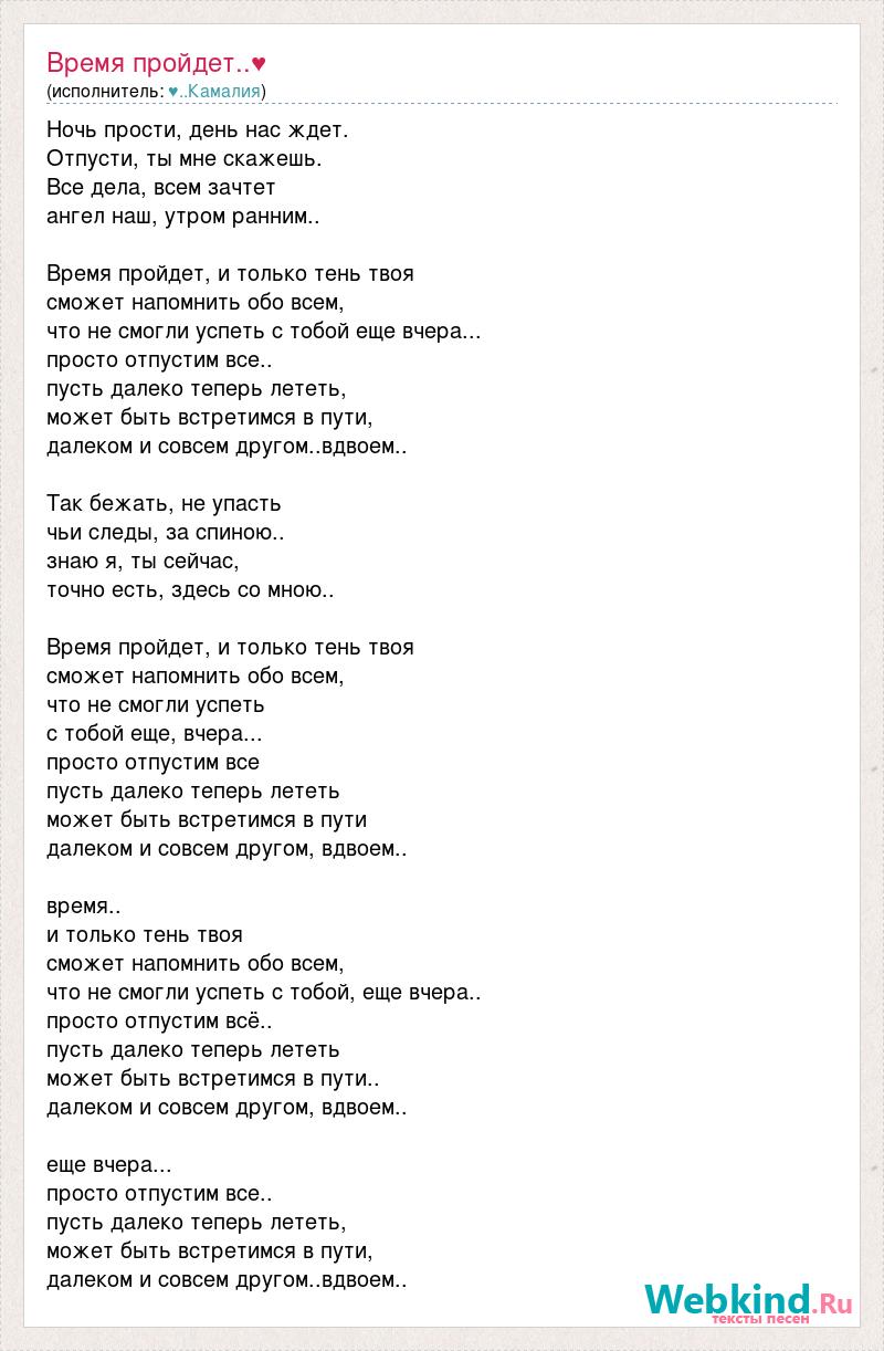 Ночь прости, день нас ждет. Отпусти, ты мне скажешь. Все дела, всем зачтет ангел наш, утром ранним.. Время пройдет, и только тень твоя сможет напомнить обо всем, что не смогли успеть с тобой еще вчера... просто отпустим все.. пусть далеко теперь лететь, может быть встретимся в пути, далеком и совсем другом..вдвоем.. Так бежать, не упасть чьи следы, за спиною.. знаю я, ты сейчас, точно есть, здесь со мною.. Время пройдет, и только тень твоя сможет напомнить обо всем, что не смогли успеть с тобой еще, вчера... просто отпустим все пусть далеко теперь лететь может быть встретимся в пути далеком и совсем другом, вдвоем.. время.. и только тень твоя сможет напомнить обо всем, что не смогли успеть с тобой, еще вчера.. просто отпустим всё.. пусть далеко теперь лететь может быть встретимся в пути.. далеком и совсем другом, вдвоем.. еще вчера... просто отпустим все.. пусть далеко теперь лететь, может быть встретимся в пути, далеком и совсем другом..вдвоем..