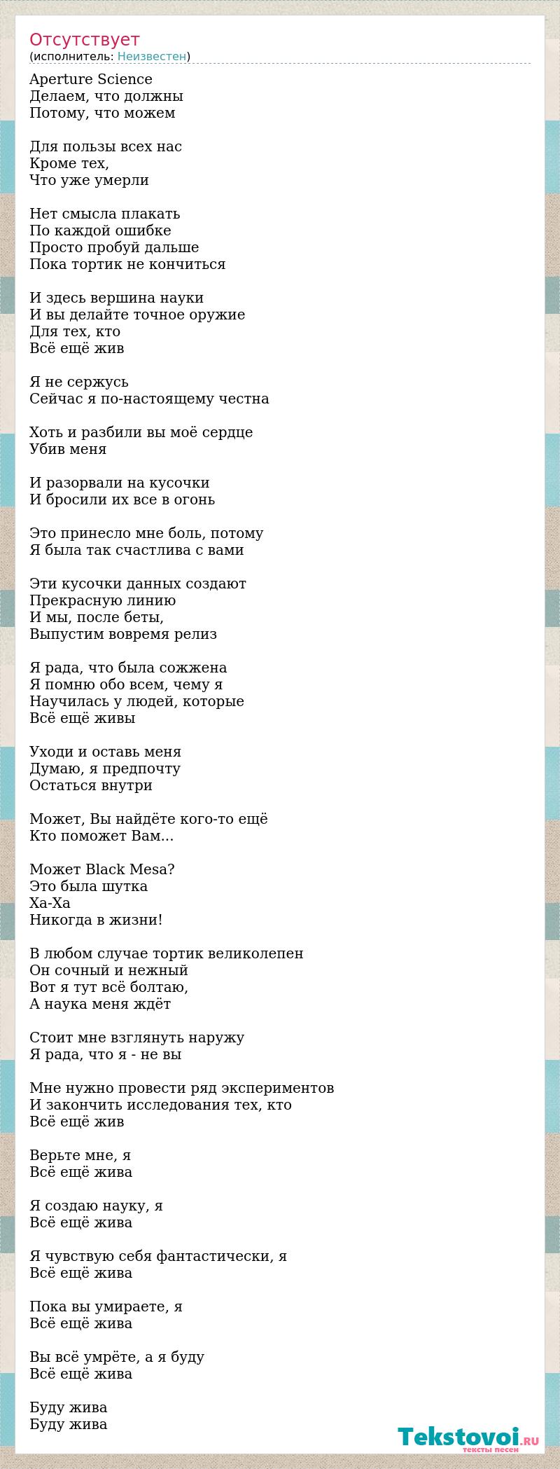 Aperture Science Делаем, что должны Потому, что можем Для пользы всех нас Кроме тех, Что уже умерли Нет смысла плакать По каждой ошибке Просто пробуй дальше Пока тортик не кончиться И здесь вершина науки И вы делайте точное оружие Для тех, кто Всё ещё жив Я не сержусь Сейчас я по-настоящему честна Хоть и разбили вы моё сердце Убив меня И разорвали на кусочки И бросили их все в огонь Это принесло мне боль, потому Я была так счастлива с вами Эти кусочки данных создают Прекрасную линию И мы, после беты, Выпустим вовремя релиз Я рада, что была сожжена Я помню обо всем, чему я Научилась у людей, которые Всё ещё живы Уходи и оставь меня Думаю, я предпочту Остаться внутри Может, Вы найдёте кого-то ещё Кто поможет Вам... Может Black Mesa? Это была шутка Ха-Ха Никогда в жизни! В любом случае тортик великолепен Он сочный и нежный Вот я тут всё болтаю, А наука меня ждёт Стоит мне взглянуть наружу Я рада, что я - не вы Мне нужно провести ряд экспериментов И закончить исследования тех, кто Всё ещё жив Верьте мне, я Всё ещё жива Я создаю науку, я Всё ещё жива Я чувствую себя фантастически, я Всё ещё жива Пока вы умираете, я Всё ещё жива Вы всё умрёте, а я буду Всё ещё жива Буду жива Буду жива