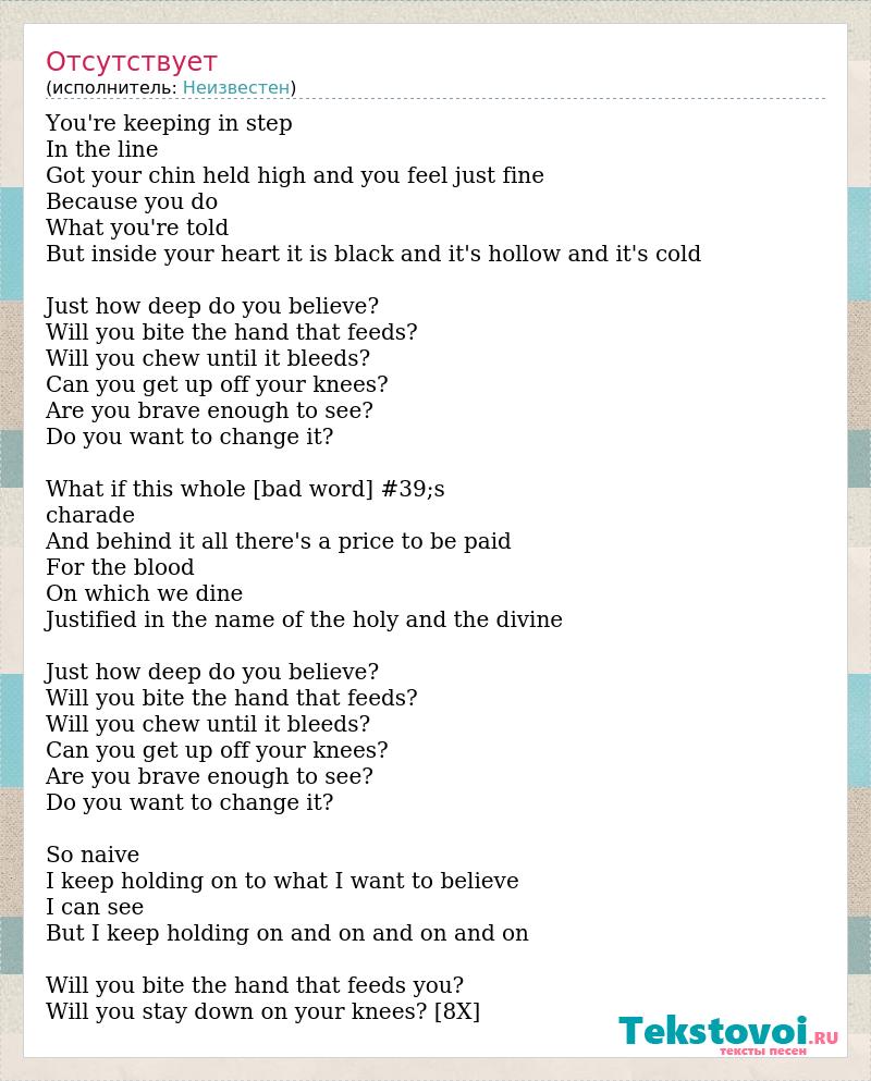 You're keeping in step In the line Got your chin held high and you feel just fine Because you do What you're told But inside your heart it is black and it's hollow and it's cold Just how deep do you believe? Will you bite the hand that feeds? Will you chew until it bleeds? Can you get up off your knees? Are you brave enough to see? Do you want to change it? What if this whole [bad word] #39;s charade And behind it all there's a price to be paid For the blood On which we dine Justified in the name of the holy and the divine Just how deep do you believe? Will you bite the hand that feeds? Will you chew until it bleeds? Can you get up off your knees? Are you brave enough to see? Do you want to change it? So naive I keep holding on to what I want to believe I can see But I keep holding on and on and on and on Will you bite the hand that feeds you? Will you stay down on your knees? [8X]
