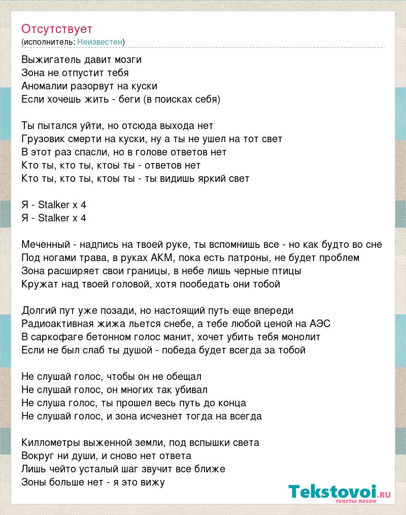 Выжигатель давит мозги Зона не отпустит тебя Аномалии разорвут на куски Если хочешь жить - беги (в поисках себя) Ты пытался уйти, но отсюда выхода нет Грузовик смерти на куски, ну а ты не ушел на тот свет В этот раз спасли, но в голове ответов нет Кто ты, кто ты, ктоы ты - ответов нет Кто ты, кто ты, ктоы ты - ты видишь яркий свет Я - Stalker х 4 Я - Stalker х 4 Меченный - надпись на твоей руке, ты вспомнишь все - но как будто во сне Под ногами трава, в руках АКМ, пока есть патроны, не будет проблем Зона расширяет свои границы, в небе лишь черные птицы Кружат над твоей головой, хотя пообедать они тобой Долгий пут уже позади, но настоящий путь еще впереди Радиоактивная жижа льется снебе, а тебе любой ценой на АЭС В саркофаге бетонном голос манит, хочет убить тебя монолит Если не был слаб ты душой - победа будет всегда за тобой Не слушай голос, чтобы он не обещал Не слушай голос, он многих так убивал Не слуша голос, ты прошел весь путь до конца Не слушай голос, и зона исчезнет тогда на всегда Киллометры выженной земли, под вспышки света Вокруг ни души, и сново нет ответа Лишь чейто усталый шаг звучит все ближе Зоны больше нет - я это вижу