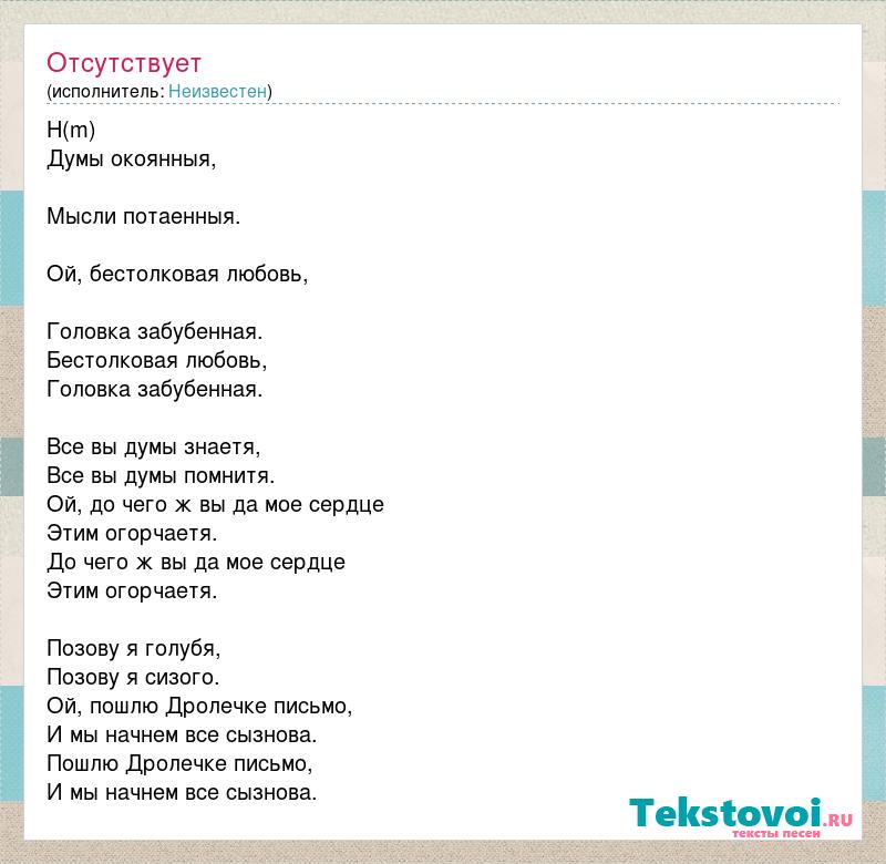 H(m) Думы окоянныя, Мысли потаенныя. Ой, бестолковая любовь, Головка забубенная. Бестолковая любовь, Головка забубенная. Все вы думы знаетя, Все вы думы помнитя. Ой, до чего ж вы да мое сердце Этим огорчаетя. До чего ж вы да мое сердце Этим огорчаетя. Позову я голубя, Позову я сизого. Ой, пошлю Дролечке письмо, И мы начнем все сызнова. Пошлю Дролечке письмо, И мы начнем все сызнова.