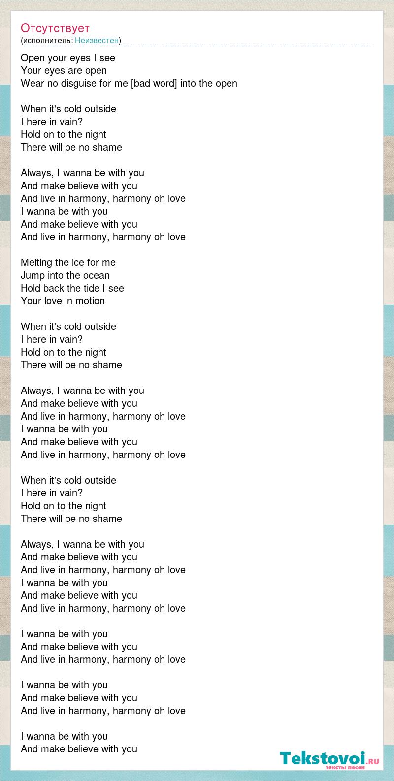 Open your eyes I see Your eyes are open Wear no disguise for me [bad word] into the open When it's cold outside I here in vain? Hold on to the night There will be no shame Always, I wanna be with you And make believe with you And live in harmony, harmony oh love I wanna be with you And make believe with you And live in harmony, harmony oh love Melting the ice for me Jump into the ocean Hold back the tide I see Your love in motion When it's cold outside I here in vain? Hold on to the night There will be no shame Always, I wanna be with you And make believe with you And live in harmony, harmony oh love I wanna be with you And make believe with you And live in harmony, harmony oh love When it's cold outside I here in vain? Hold on to the night There will be no shame Always, I wanna be with you And make believe with you And live in harmony, harmony oh love I wanna be with you And make believe with you And live in harmony, harmony oh love I wanna be with you And make believe with you And live in harmony, harmony oh love I wanna be with you And make believe with you And live in harmony, harmony oh love I wanna be with you And make believe with you