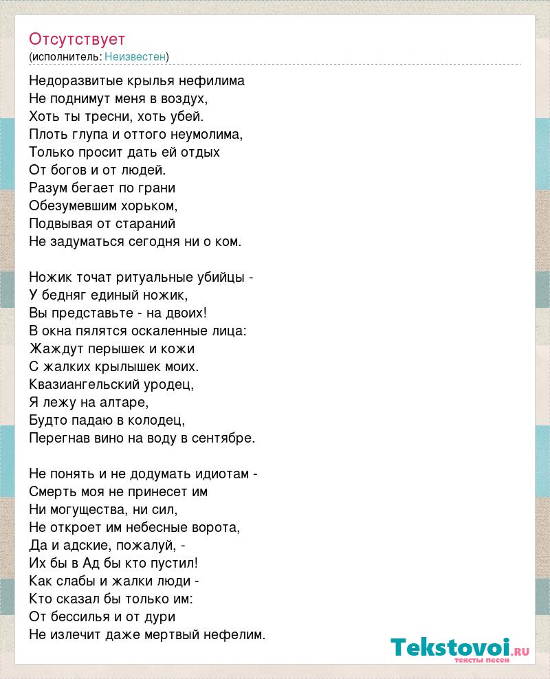 Недоразвитые крылья нефилима Не поднимут меня в воздух, Хоть ты тресни, хоть убей. Плоть глупа и оттого неумолима, Только просит дать ей отдых От богов и от людей. Разум бегает по грани Обезумевшим хорьком, Подвывая от стараний Не задуматься сегодня ни о ком. Ножик точат ритуальные убийцы - У бедняг единый ножик, Вы представьте - на двоих! В окна пялятся оскаленные лица: Жаждут перышек и кожи С жалких крылышек моих. Квазиангельский уродец, Я лежу на алтаре, Будто падаю в колодец, Перегнав вино на воду в сентябре. Не понять и не додумать идиотам - Смерть моя не принесет им Ни могущества, ни сил, Не откроет им небесные ворота, Да и адские, пожалуй, - Их бы в Ад бы кто пустил! Как слабы и жалки люди - Кто сказал бы только им: От бессилья и от дури Не излечит даже мертвый нефелим.