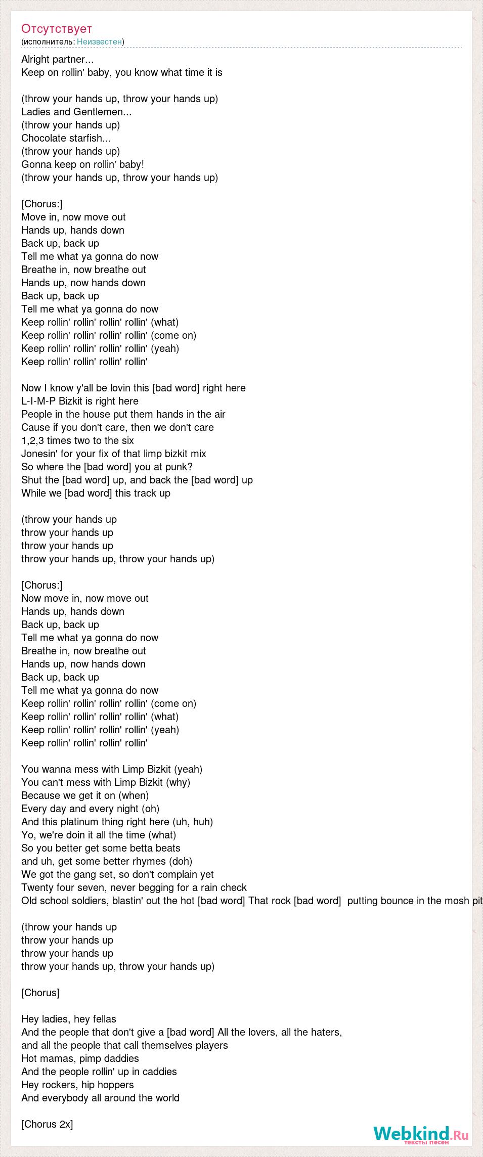 Alright partner... Keep on rollin' baby, you know what time it is (throw your hands up, throw your hands up) Ladies and Gentlemen... (throw your hands up) Chocolate starfish... (throw your hands up) Gonna keep on rollin' baby! (throw your hands up, throw your hands up) [bad word] ] Move in, now move out Hands up, hands down Back up, back up Tell me what ya gonna do now Breathe in, now breathe out Hands up, now hands down Back up, back up Tell me what ya gonna do now Keep rollin' rollin' rollin' rollin' (what) Keep rollin' rollin' rollin' rollin' [bad word] on) Keep rollin' rollin' rollin' rollin' (yeah) Keep rollin' rollin' rollin' rollin' Now I know y'all be lovin this [bad word] right here L-I-M-P Bizkit is right here People in the house put them hands in the air Cause if you don't care, then we don't care 1,2,3 times two to the six Jonesin' for your fix of that limp bizkit mix So where the [bad word] you at punk? Shut the [bad word] up, and back the [bad word] up While we [bad word] this track up (throw your hands up throw your hands up throw your hands up throw your hands up, throw your hands up) [bad word] ] Now move in, now move out Hands up, hands down Back up, back up Tell me what ya gonna do now Breathe in, now breathe out Hands up, now hands down Back up, back up Tell me what ya gonna do now Keep rollin' rollin' rollin' rollin' [bad word] on) Keep rollin' rollin' rollin' rollin' (what) Keep rollin' rollin' rollin' rollin' (yeah) Keep rollin' rollin' rollin' rollin' You wanna mess with Limp Bizkit (yeah) You can't mess with Limp Bizkit (why) Because we get it on (when) Every day and every night (oh) And this platinum thing right here (uh, huh) Yo, we're doin it all the time (what) So you better get some betta beats and uh, get some better rhymes (doh) We got the gang set, so [bad word] yet Twenty four seven, never begging for a rain check Old school soldiers, blastin' out the hot [bad word] That rock [bad word] putting bounce in the mosh pit (throw your hands up throw your hands up throw your hands up throw your hands up, throw your hands up) [bad word] Hey ladies, hey fellas And the people that don't give a [bad word] All the lovers, all the haters, and all the people that call themselves players Hot mamas, pimp daddies And the people rollin' up in caddies Hey rockers, hip hoppers And everybody all around the world [bad word] 2x]