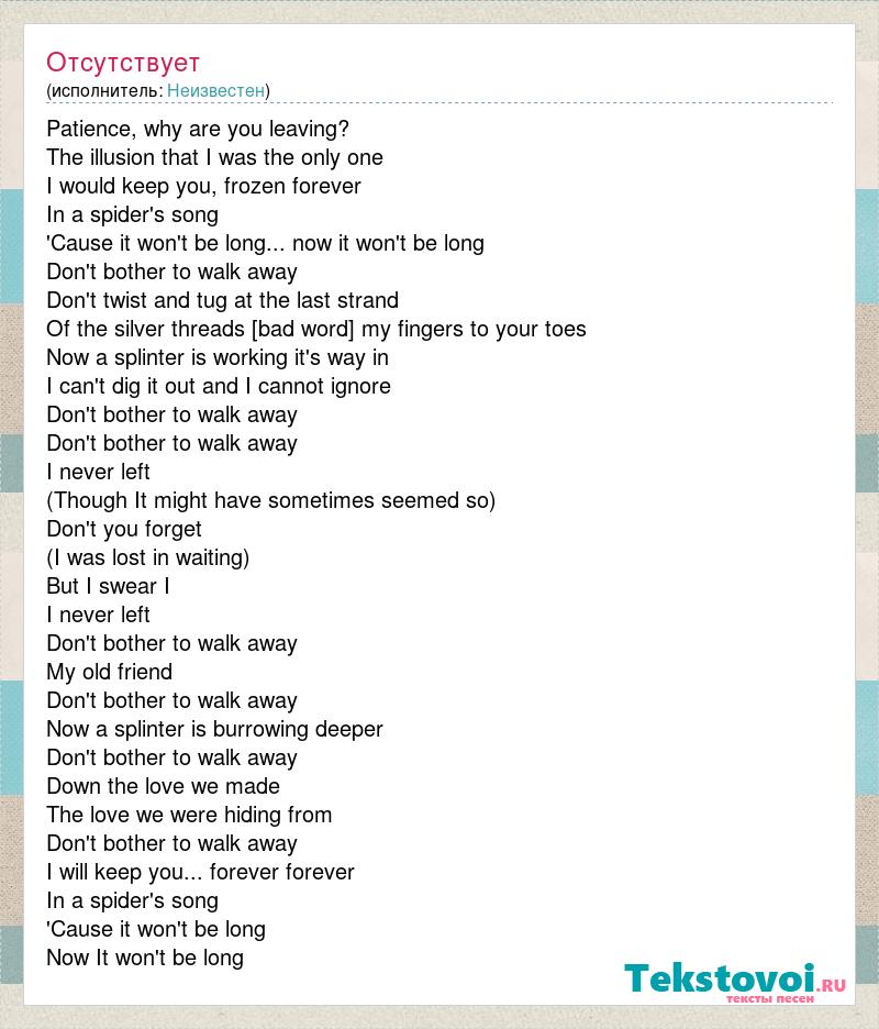 Patience, why are you leaving? The illusion that I was the only one I would keep you, frozen forever In a spider's song 'Cause it won't be long... now it won't be long Don't bother to walk away Don't twist and tug at the last strand Of the silver threads [bad word] my fingers to your toes Now a splinter is working it's way in I can't dig it out and I cannot ignore Don't bother to walk away Don't bother to walk away I never left (Though It might have sometimes seemed so) Don't you forget (I was lost in waiting) But I swear I I never left Don't bother to walk away My old friend Don't bother to walk away Now a splinter is burrowing deeper Don't bother to walk away Down the love we made The love we were hiding from Don't bother to walk away I will keep you... forever forever In a spider's song 'Cause it won't be long Now It won't be long