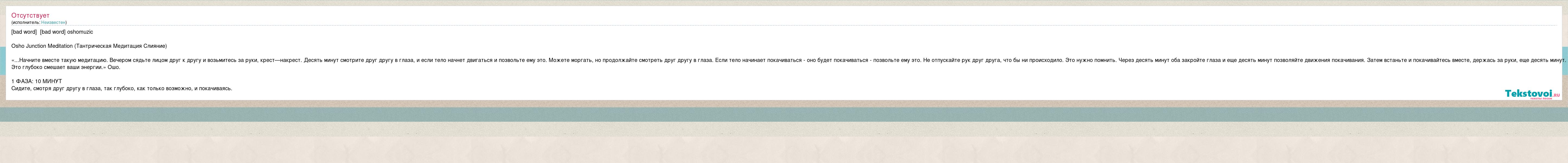 [bad word] [bad word] oshomuzic Osho Junction Meditation (Тантрическая Медитация Слияние) «...Начните вместе такую медитацию. Вечером сядьте лицом друг к другу и возьмитесь за руки, крест—накрест. Десять минут смотрите друг другу в глаза, и если тело начнет двигаться и позвольте ему это. Можете моргать, но продолжайте смотреть друг другу в глаза. Если тело начинает покачиваться - оно будет покачиваться - позвольте ему это. Не отпускайте рук друг друга, что бы ни происходило. Это нужно помнить. Через десять минут оба закройте глаза и еще десять минут позволяйте движения покачивания. Затем встаньте и покачивайтесь вместе, держась за руки, еще десять минут. Это глубоко смешает ваши энергии.» Ошо. 1 ФАЗА: 10 МИНУТ Сидите, смотря друг другу в глаза, так глубоко, как только возможно, и покачиваясь.