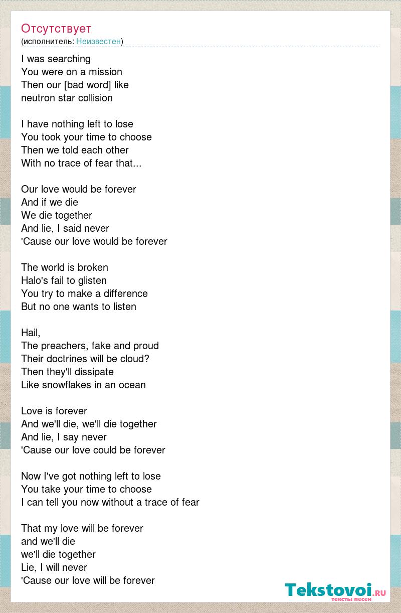 I was searching You were on a mission Then our [bad word] like neutron star collision I have nothing left to lose You took your time to choose Then we told each other With no trace of fear that... Our love would be forever And if we die We die together And lie, I said never 'Cause our love would be forever The world is broken Halo's fail to glisten You try to make a difference But no one wants to listen Hail, The preachers, fake and proud Their doctrines will be cloud? Then they'll dissipate Like snowflakes in an ocean Love is forever And we'll die, we'll die together And lie, I say never 'Cause our love could be forever Now I've got nothing left to lose You take your time to choose I can tell you now without a trace of fear That my love will be forever and we'll die we'll die together Lie, I will never 'Cause our love will be forever