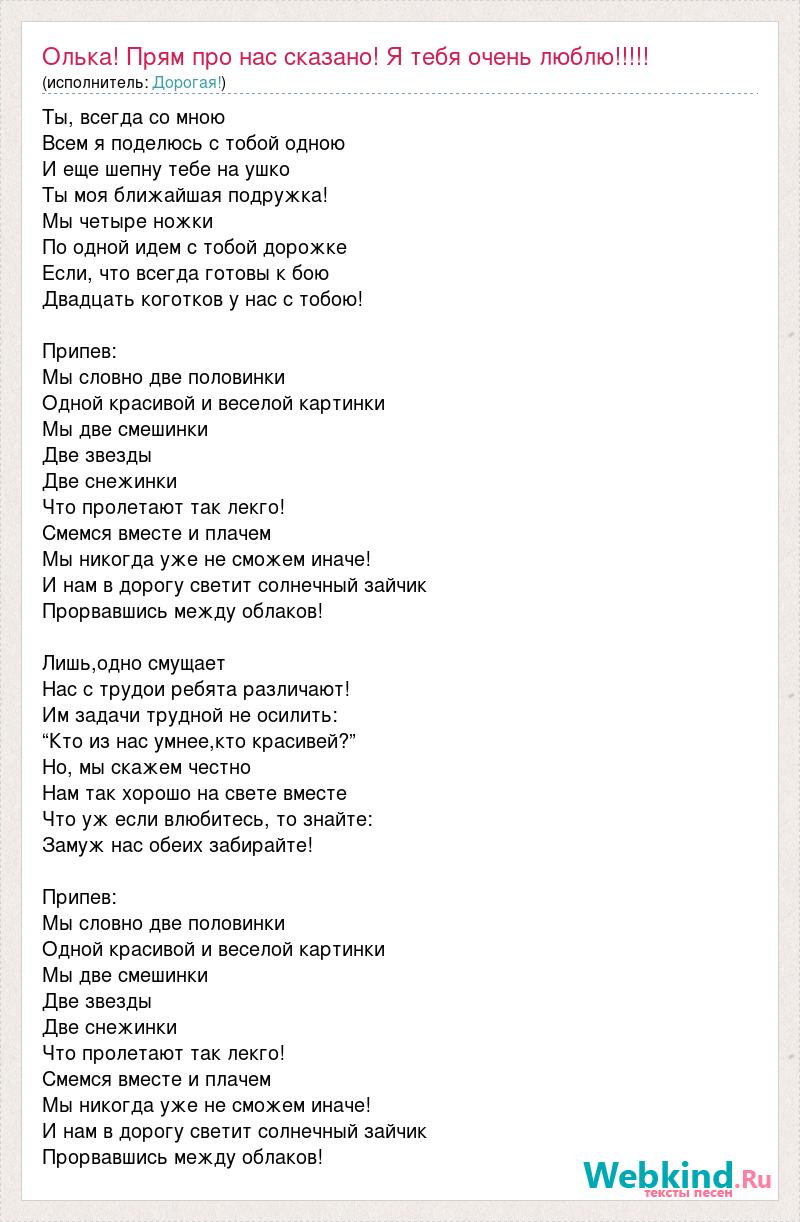 Ты, всегда со мною Всем я поделюсь с тобой одною И еще шепну тебе на ушко Ты моя ближайшая подружка! Мы четыре ножки По одной идем с тобой дорожке Если, что всегда готовы к бою Двадцать коготков у нас с тобою! Припев: Мы словно две половинки Одной красивой и веселой картинки Мы две смешинки Две звезды Две снежинки Что пролетают так лекго! Смемся вместе и плачем Мы никогда уже не сможем иначе! И нам в дорогу светит солнечный зайчик Прорвавшись между облаков! Лишь,одно смущает Нас с трудои ребята различают! Им задачи трудной не осилить: “Кто из нас умнее,кто красивей?” Но, мы скажем честно Нам так хорошо на свете вместе Что уж если влюбитесь, то знайте: Замуж нас обеих забирайте! Припев: Мы словно две половинки Одной красивой и веселой картинки Мы две смешинки Две звезды Две снежинки Что пролетают так лекго! Смемся вместе и плачем Мы никогда уже не сможем иначе! И нам в дорогу светит солнечный зайчик Прорвавшись между облаков!