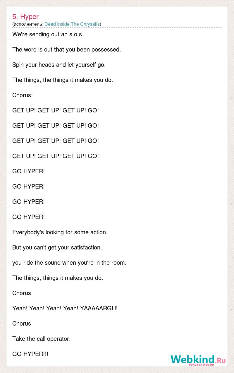 We're sending out an s.o.s. The word is out that you been possessed. Spin your heads and let yourself go. The things, the things it makes you do. [bad word] GET UP! GET UP! GET UP! GO! GET UP! GET UP! GET UP! GO! GET UP! GET UP! GET UP! GO! GET UP! GET UP! GET UP! GO! GO HYPER! GO HYPER! GO HYPER! GO HYPER! Everybody's looking for some action. But you can't get your satisfaction. you ride the sound when you're in the room. The things, things it makes you do. [bad word] Yeah! Yeah! Yeah! Yeah! YAAAAARGH! [bad word] Take the call operator. GO HYPER!!!