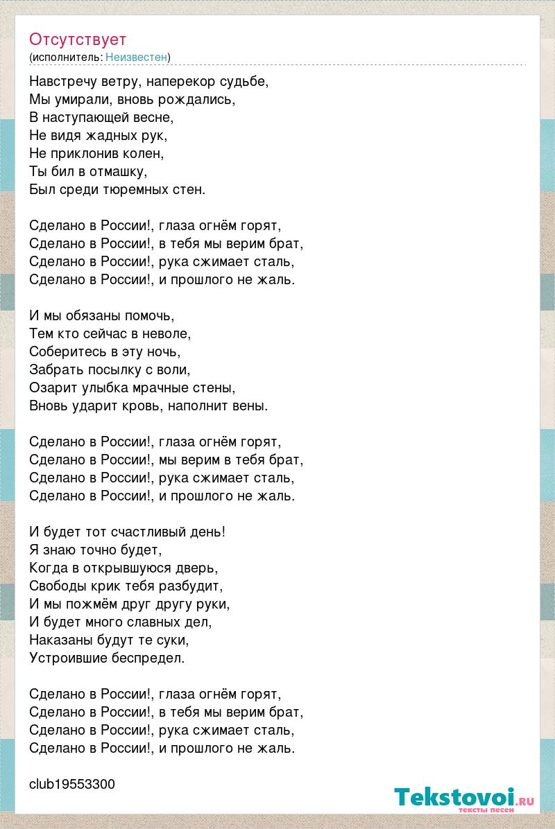 Навстречу ветру, наперекор судьбе, Мы умирали, вновь рождались, В наступающей весне, Не видя жадных рук, Не приклонив колен, Ты бил в отмашку, Был среди тюремных стен. Сделано в России!, глаза огнём горят, Сделано в России!, в тебя мы верим брат, Сделано в России!, рука сжимает сталь, Сделано в России!, и прошлого не жаль. И мы обязаны помочь, Тем кто сейчас в неволе, Соберитесь в эту ночь, Забрать посылку с воли, Озарит улыбка мрачные стены, Вновь ударит кровь, наполнит вены. Сделано в России!, глаза огнём горят, Сделано в России!, мы верим в тебя брат, Сделано в России!, рука сжимает сталь, Сделано в России!, и прошлого не жаль. И будет тот счастливый день! Я знаю точно будет, Когда в открывшуюся дверь, Свободы крик тебя разбудит, И мы пожмём друг другу руки, И будет много славных дел, Наказаны будут те суки, Устроившие беспредел. Сделано в России!, глаза огнём горят, Сделано в России!, в тебя мы верим брат, Сделано в России!, рука сжимает сталь, Сделано в России!, и прошлого не жаль. club19553300