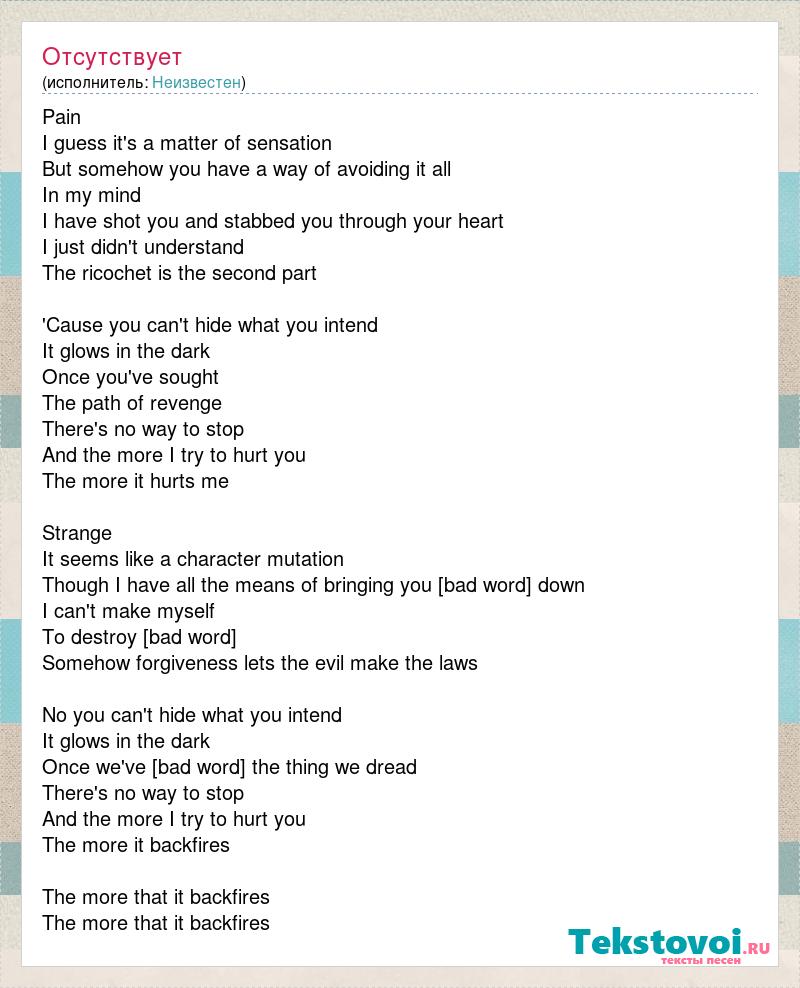 Pain I guess it's a matter of sensation But somehow you have a way of avoiding it all In my mind I have shot you and stabbed you through your heart I just didn't understand The ricochet is the second part 'Cause you can't hide what you intend It glows in the dark Once you've sought The path of revenge There's no way to stop And the more I try to hurt you The more it hurts me Strange It seems like a character mutation Though I have all the means of bringing you [bad word] down I can't make myself To destroy [bad word] Somehow forgiveness lets the evil make the laws No you can't hide what you intend It glows in the dark Once we've [bad word] the thing we dread There's no way to stop And the more I try to hurt you The more it backfires The more that it backfires The more that it backfires