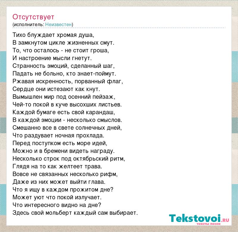 Тихо блуждает хромая душа, В замкнутом цикле жизненных смут. То, что осталось - не стоит гроша, И настроение мысли гнетут. Странность эмоций, сделанный шаг, Падать не больно, кто знает-поймут. Ржавая искренность, порванный флаг, Сердце они истезают как кнут. Вымышлен мир под осенний пейзаж, Чей-то покой в куче высохших листьев. Каждой бумаге есть свой карандаш, В каждой эмоции - несколько смыслов. Смешанно все в свете солнечных дней, Что раздувает ночная прохлада. Перед поступком есть море идей, Можно и в бремени видеть награду. Несколько строк под октябрьский ритм, Глядя на то как желтеет трава. Вовсе не связанных несколько рифм, Даже из них может выйти глава. Что я ищу в каждом прожитом дне? Может уют что покой излучает. Что интересного видно на дне? Здесь свой мольберт каждый сам выбирает.