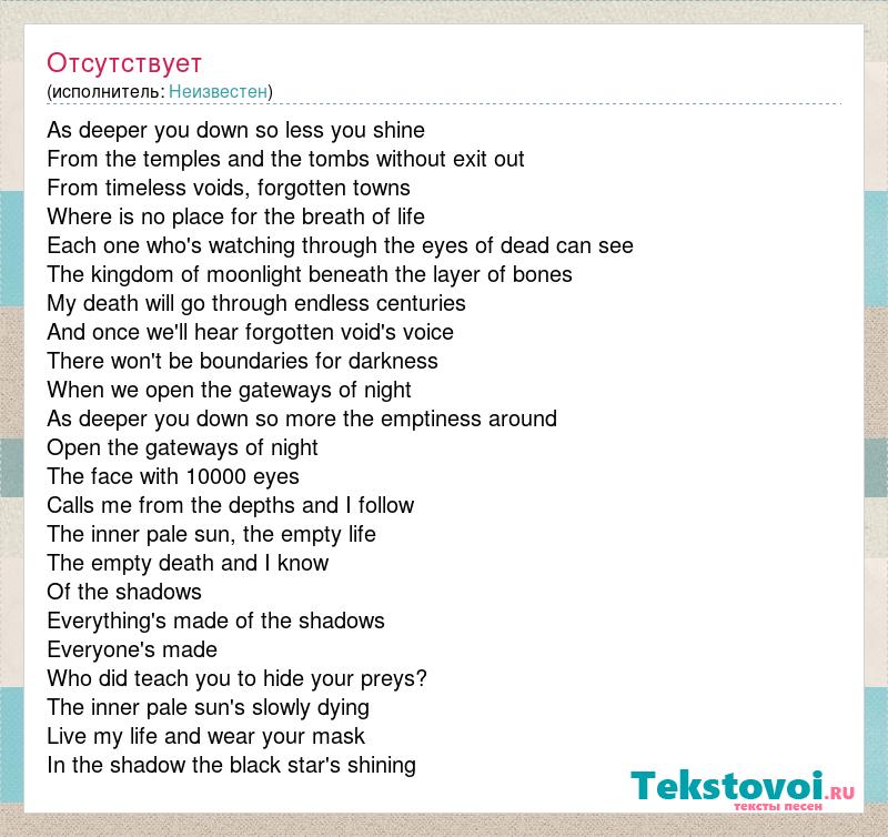 As deeper you down so less you shine From the temples and the tombs without exit out From timeless voids, forgotten towns Where is no place for the breath of life Each one who's watching through the eyes of dead can see The kingdom of moonlight beneath the layer of bones My death will go through endless centuries And once we'll hear forgotten void's voice There won't be boundaries for darkness When we open the gateways of night As deeper you down so more the emptiness around Open the gateways of night The face with 10000 eyes Calls me from the depths and I follow The inner pale sun, the empty life The empty death and I know Of the shadows Everything's made of the shadows Everyone's made Who did teach you to hide your preys? The inner pale sun's slowly dying Live my life and wear your mask In the shadow the black star's shining