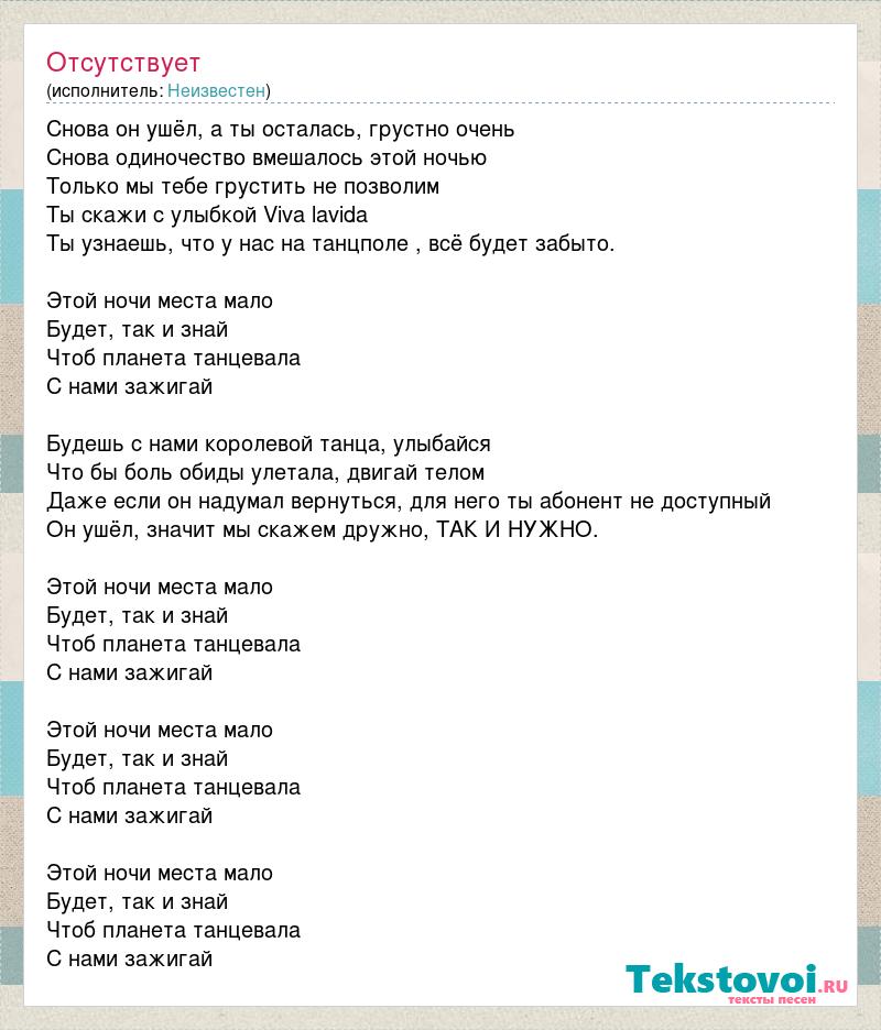 Снова он ушёл, а ты осталась, грустно очень Снова одиночество вмешалось этой ночью Только мы тебе грустить не позволим Ты скажи с улыбкой Viva lavida Ты узнаешь, что у нас на танцполе , всё будет забыто. Этой ночи места мало Будет, так и знай Чтоб планета танцевала С нами зажигай Будешь с нами королевой танца, улыбайся Что бы боль обиды улетала, двигай телом Даже если он надумал вернуться, для него ты абонент не доступный Он ушёл, значит мы скажем дружно, ТАК И НУЖНО. Этой ночи места мало Будет, так и знай Чтоб планета танцевала С нами зажигай Этой ночи места мало Будет, так и знай Чтоб планета танцевала С нами зажигай Этой ночи места мало Будет, так и знай Чтоб планета танцевала С нами зажигай